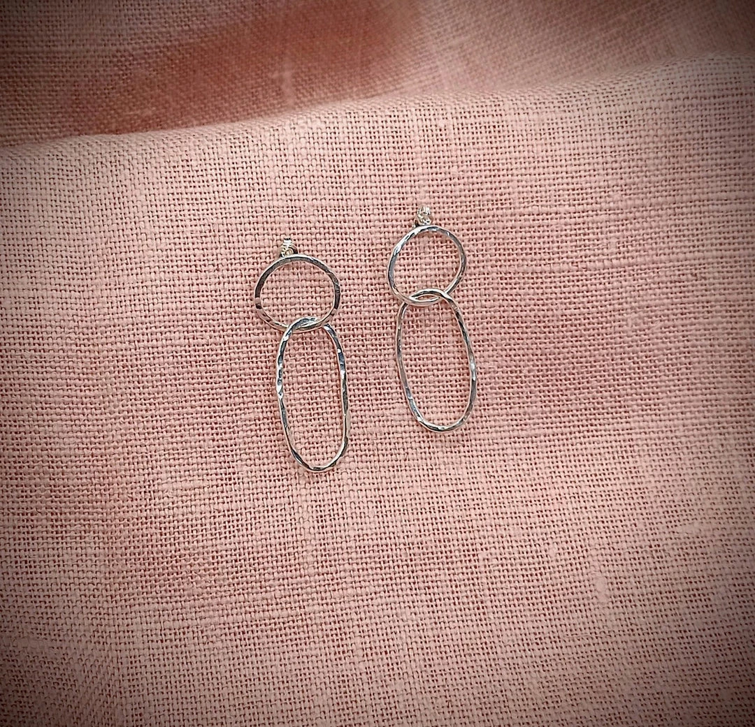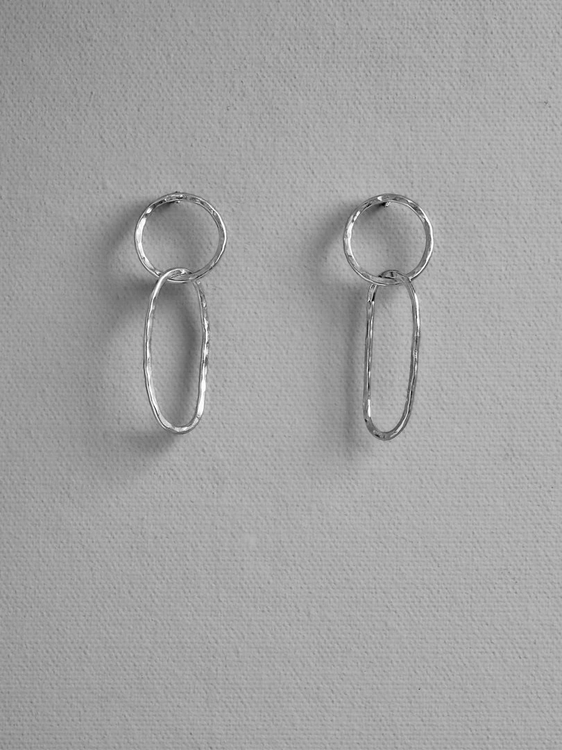Simple and wearable swing studs that are sophisticated yet playful. The round stud sits snugly on your ear while the textured link moves freely playing with the light.