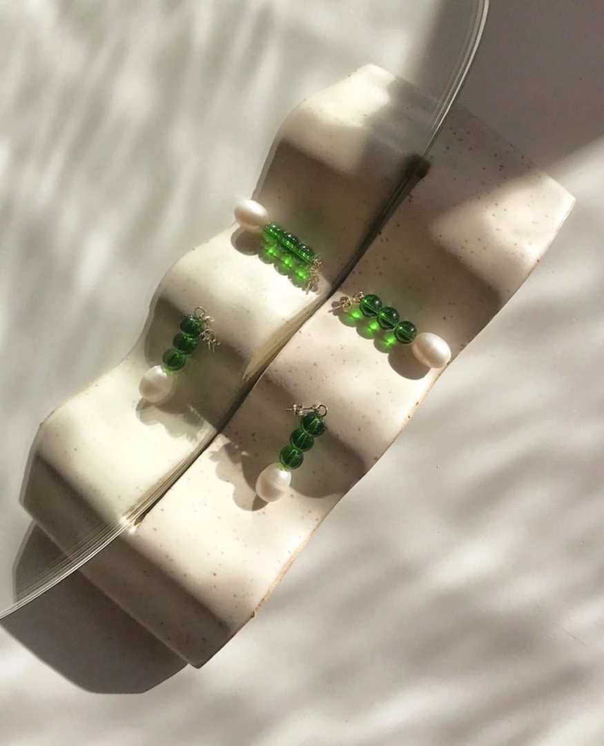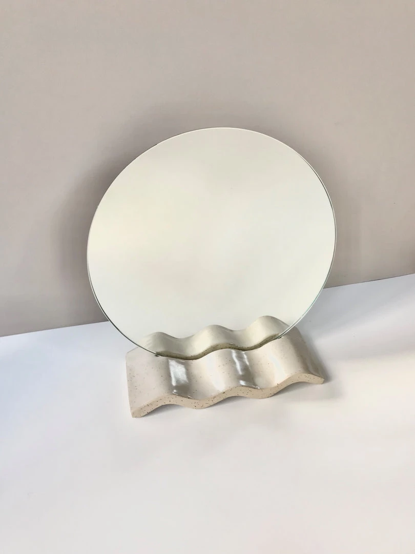 The handmade ceramic base is an off white speckled stoneware with a translucent white glaze. The mirror is cut and hand polished by a local supplier in Pōneke, Wellington and backed with a light green safety vinyl.