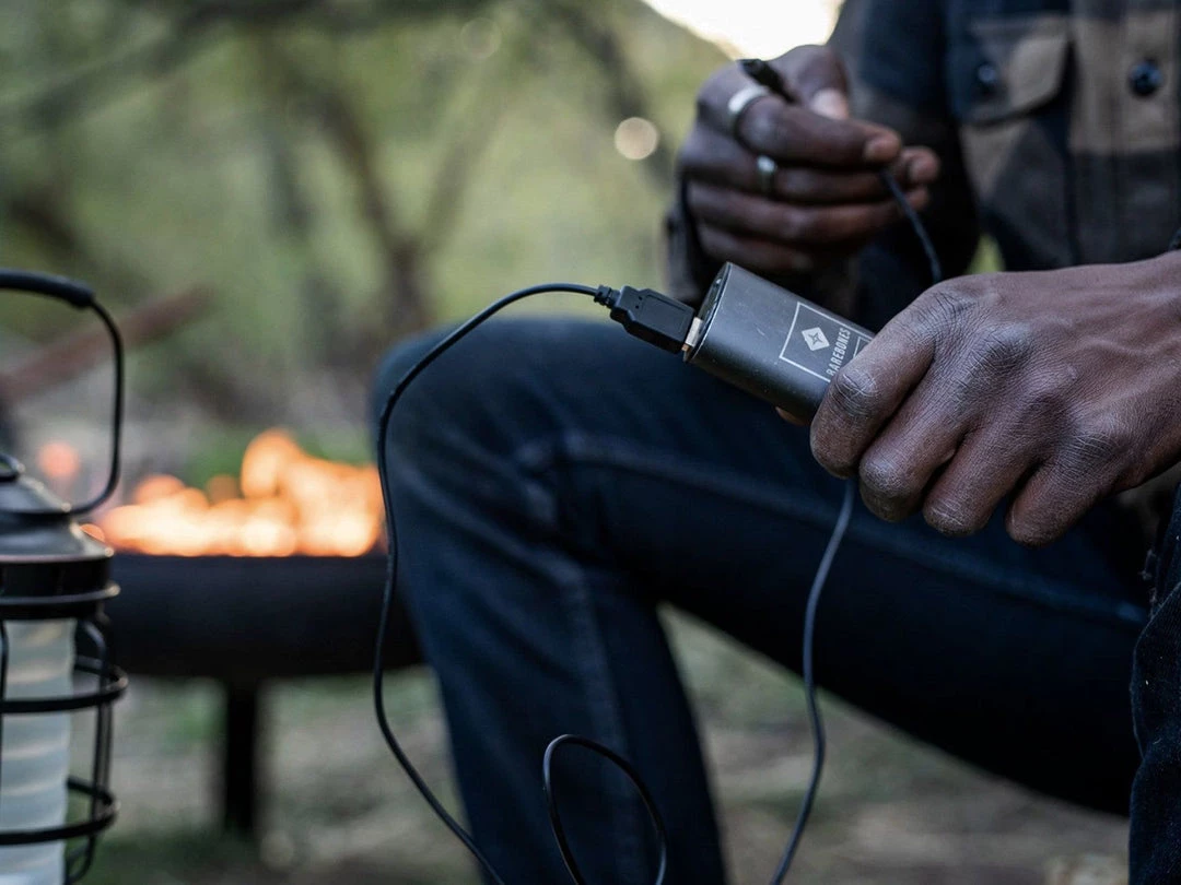 Power your Barebones lights with the Portable Charger. Compact and light with a durable aluminum case, the Portable Charger is a rechargeable power bank that works with any USB-compatible device – phones and the like.