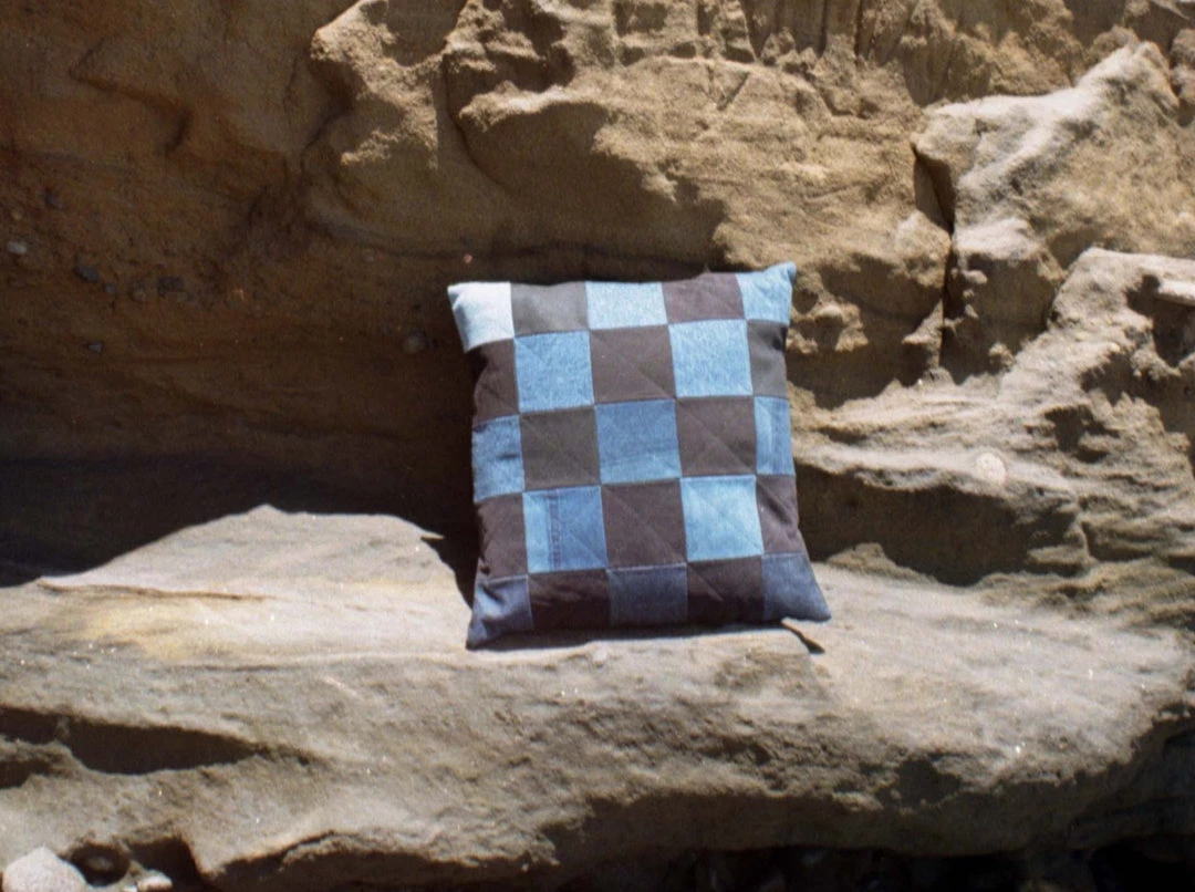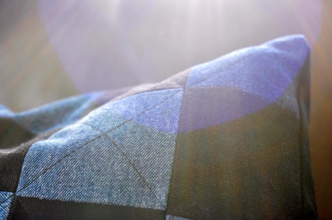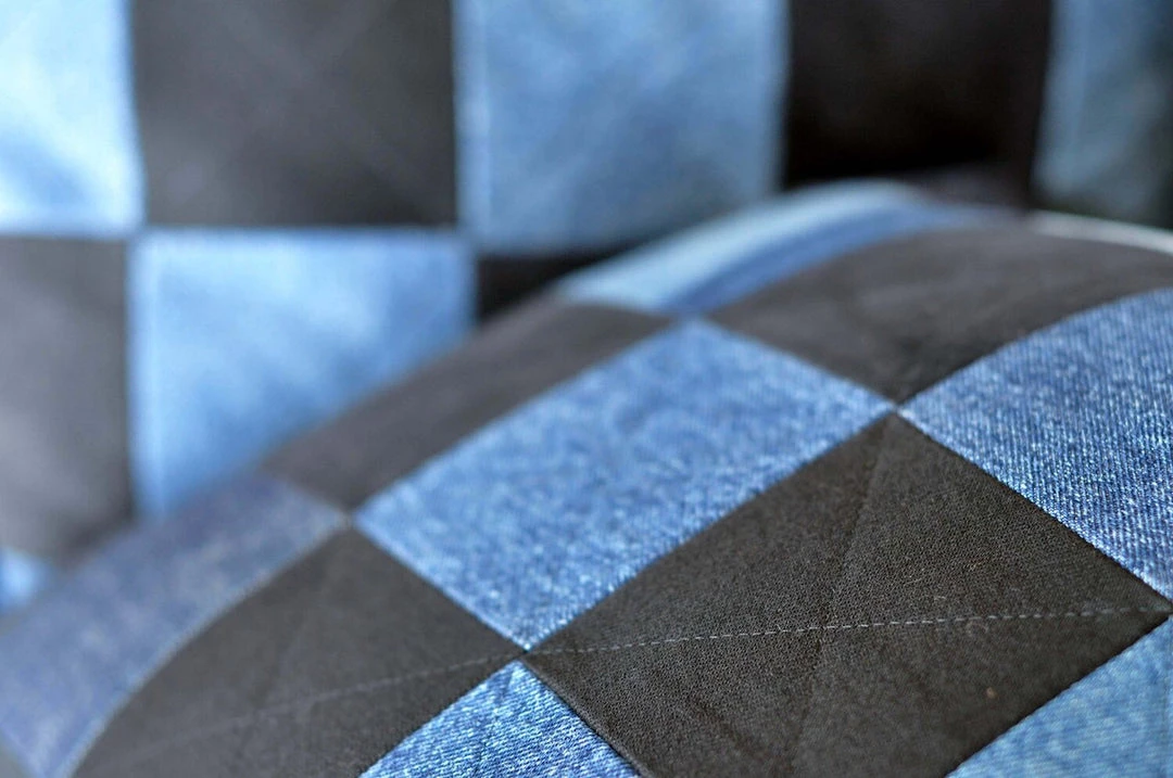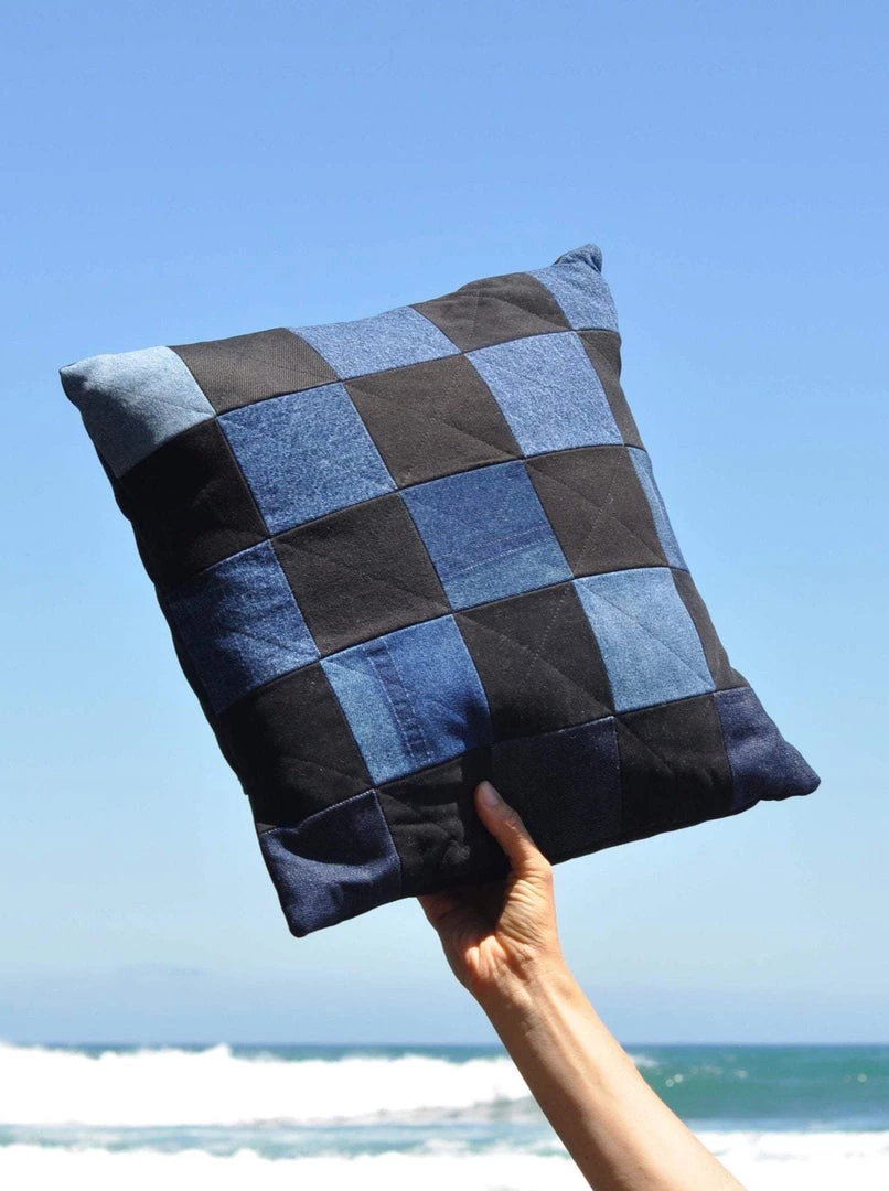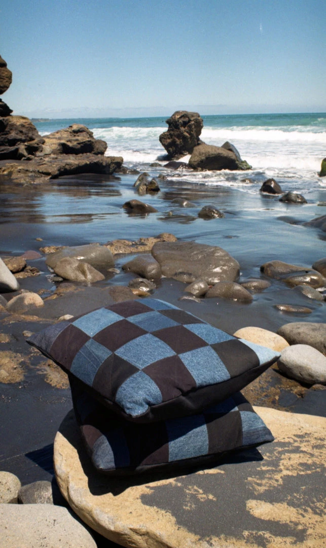 Hard wearing checkered cushions created from the offcuts of the vintage jeans that they reconstruct into hats, paired with deadstock Japanese black denim. Each differs a little. Cover can be removed to wash.