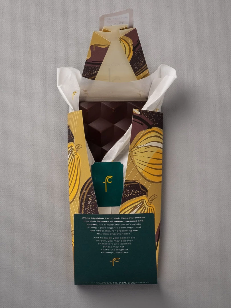 While Masidau Farm, Epi, Vanuatu evokes moreish flavours of toffee, caramel and mocha, it’s simply the cacao’s origin talking – plus organic cane sugar and our obsession for preserving the flavours of provenance. And because your senses are unique, you may discover characters and aromas others may not – that’s the magic of Foundry Chocolate.