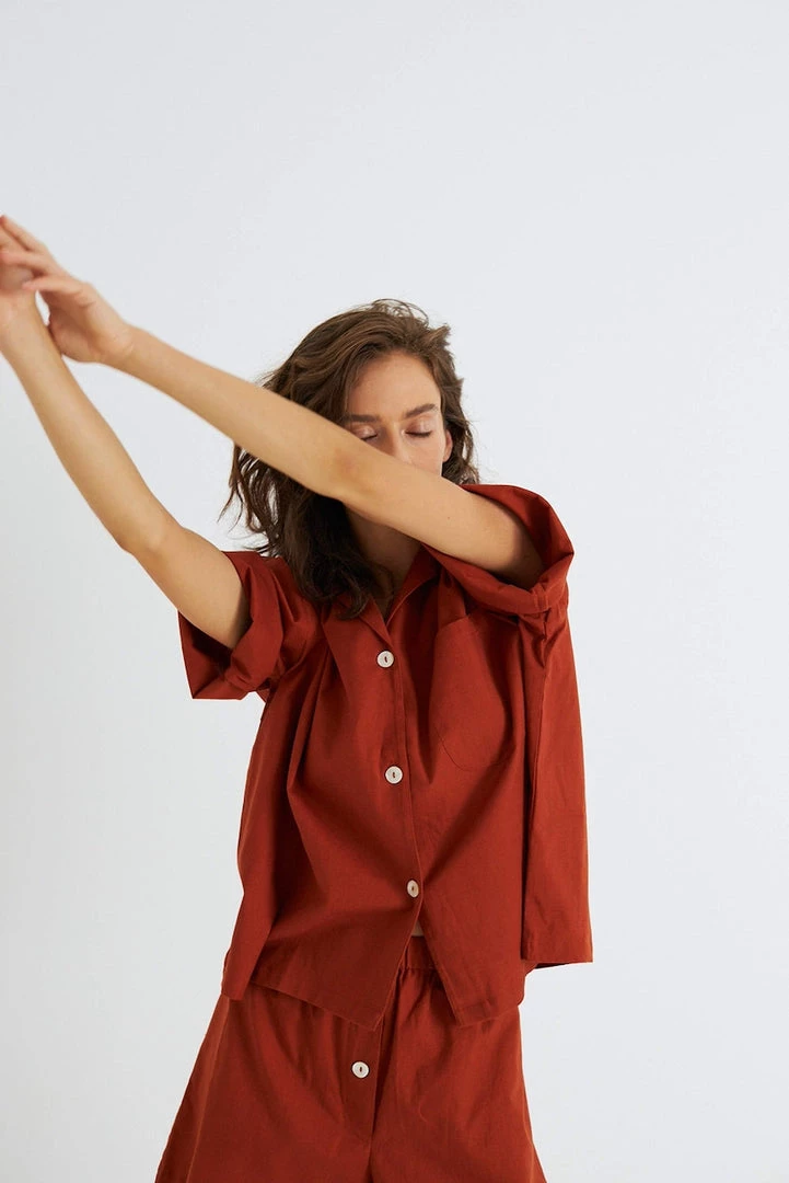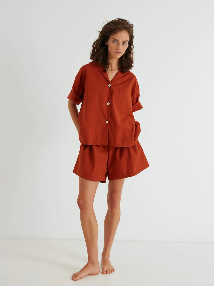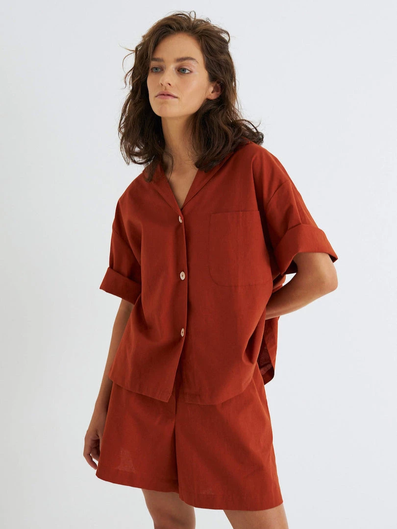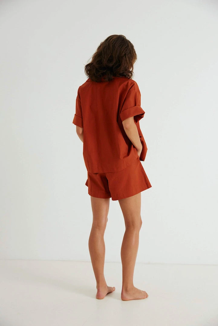 Boxy single pocket short sleeve shirt, with back box pleat. High waisted shorts with button fly detail, elasticated waistband and side pockets. All pieces are French seamed.