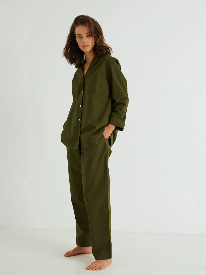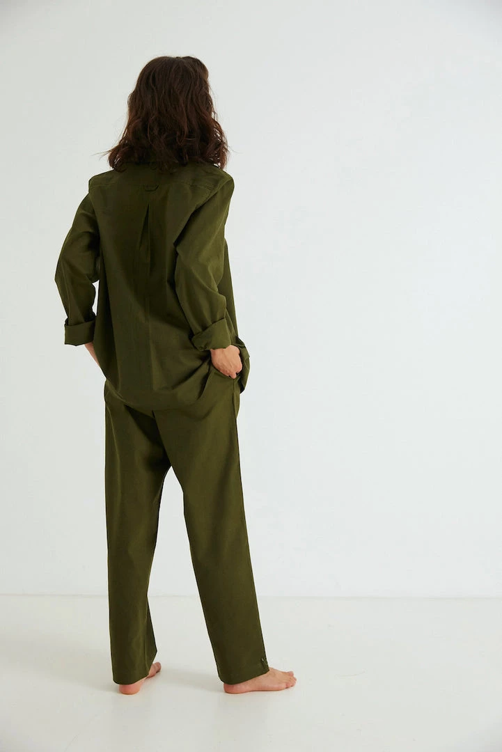 Single pocket shirt, with back box pleat and locker loop detail. Straight leg trouser, with an elasticated waistband and side pockets. All pieces are finished with French seams.
