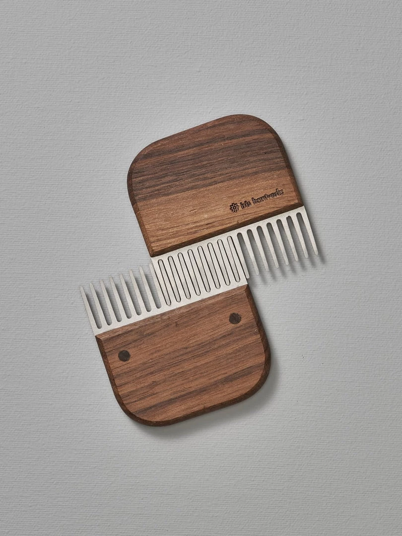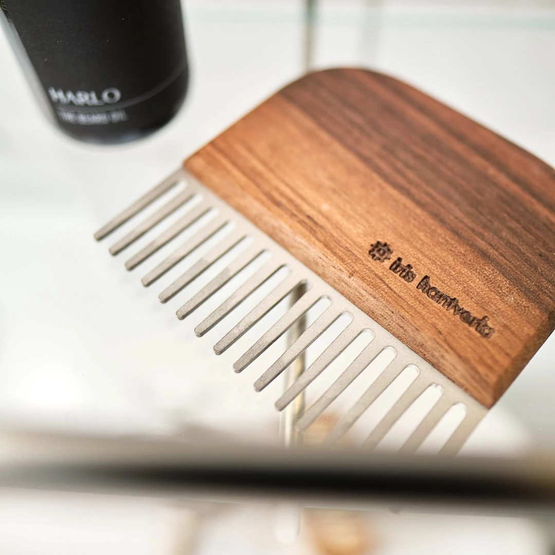 The essential tool for a well groomed beard – in oiled walnut and stainless steel with sandblasted finish. The teeth are tightly seated which also makes it suitable for combining mustache. Grip-friendly and in the right size to bring with you in your pocket every day for when the need (or itch) arises.