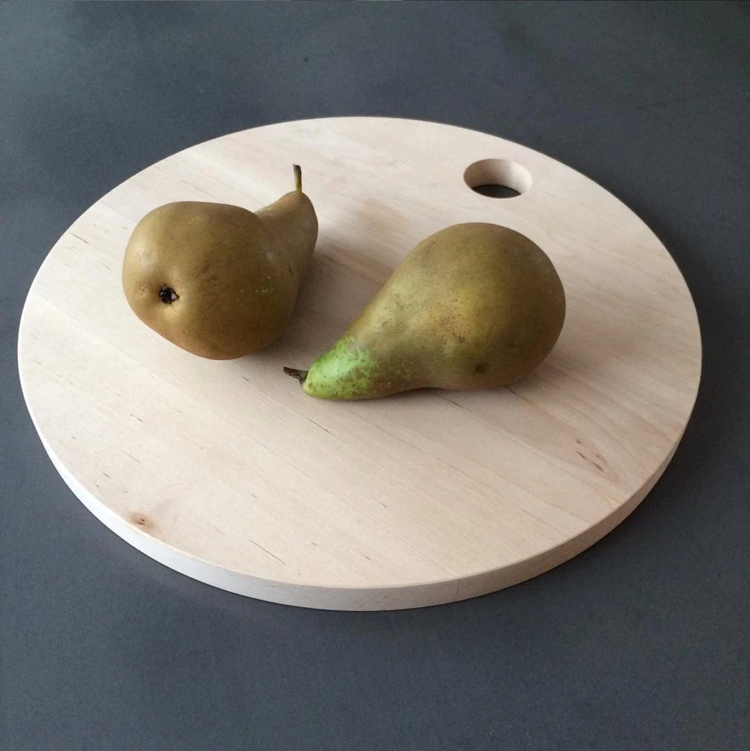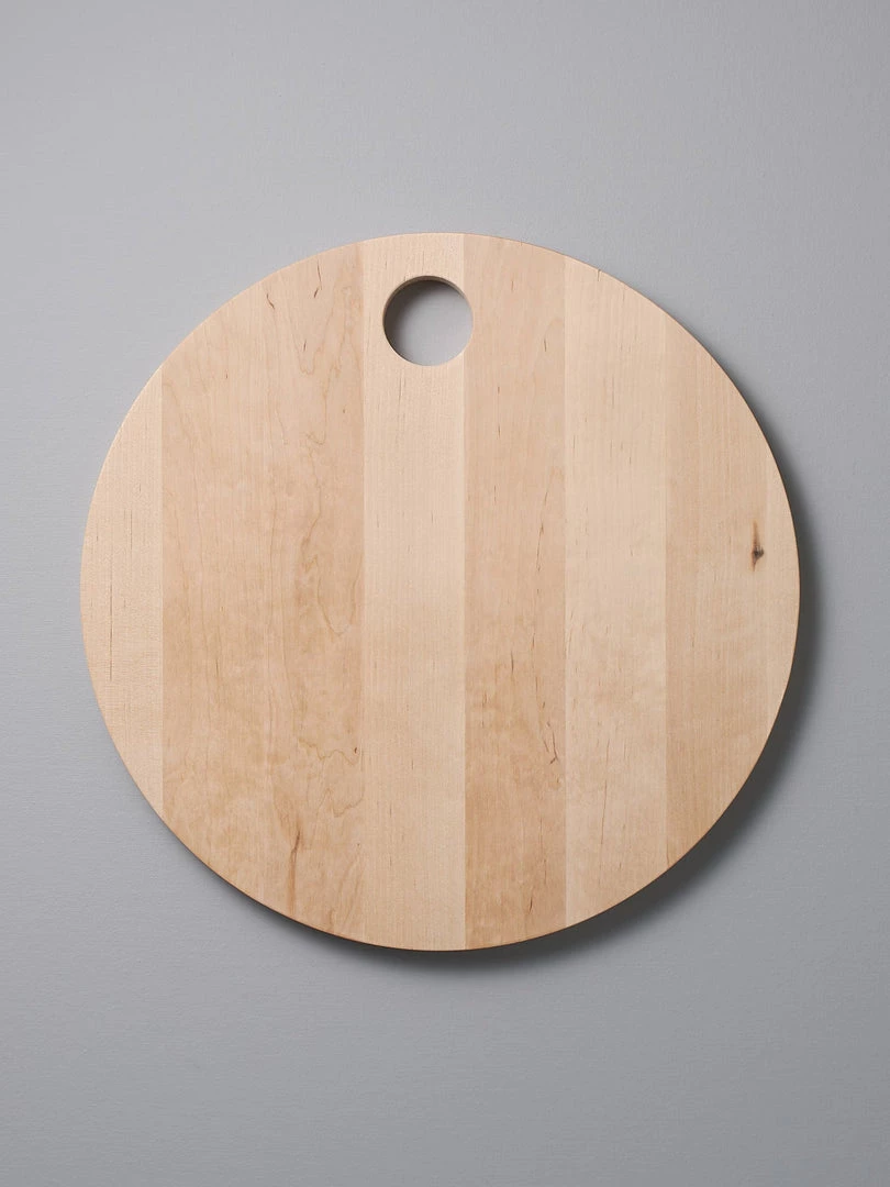A round cutting board that doubles as a cheese board as well a handy serving tray.