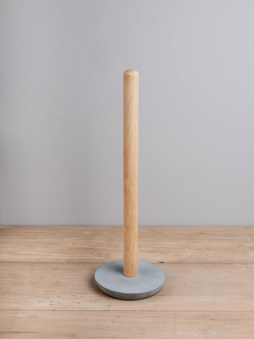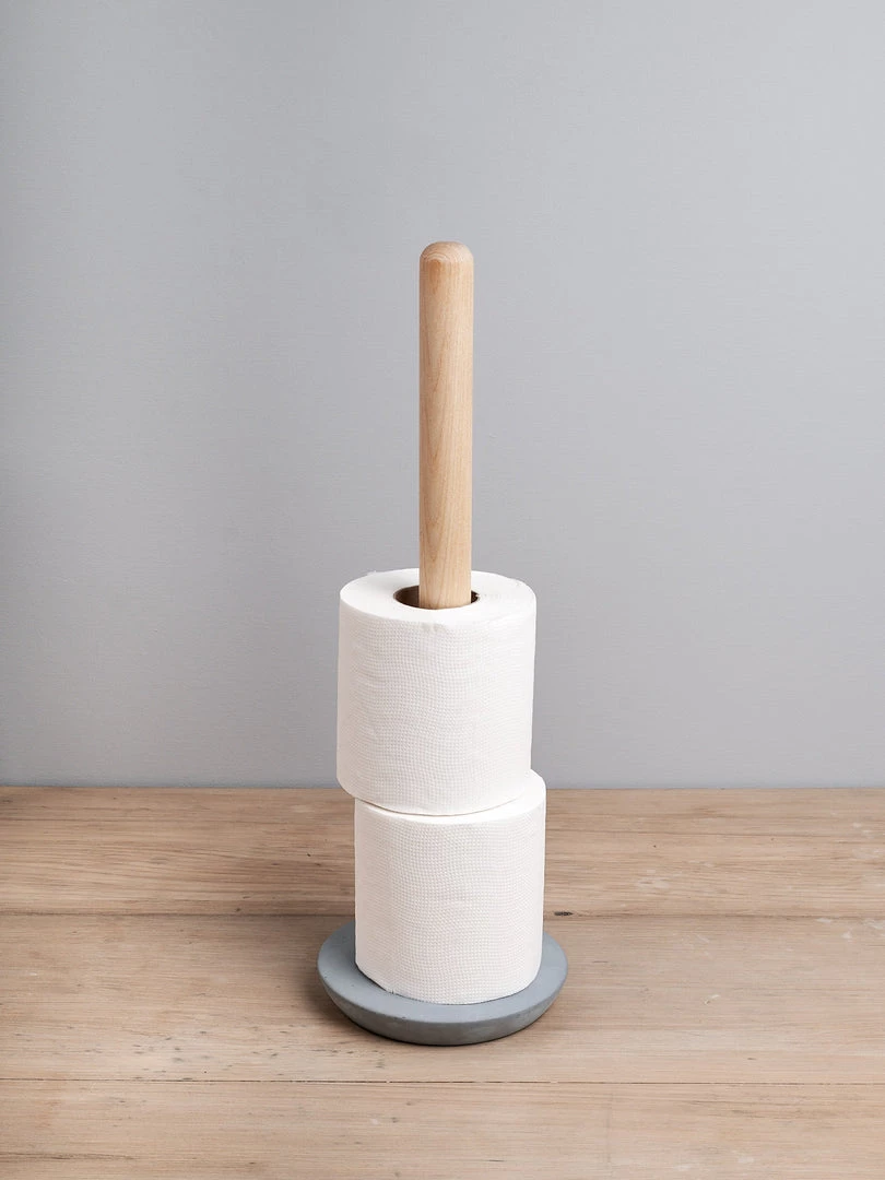 Modestly styled toilet roll holder, crafted from soft concrete and beechwood. Soft concrete is an innovative material made by including a small addition of polymers, and as a result the concrete becomes elastic and pliable. It contains no environmentally harmful substances. Moulded by hand in a small foundry outside of Stockholm, the soft concrete retains the characteristics of a resilient stone material, but with a smooth, pleasant feel to it. Varying smoothness and colour variations occur on the surface of this concrete, due to the irregularities of the crafting technique, which add to the vibrant and unique expression in each piece.
