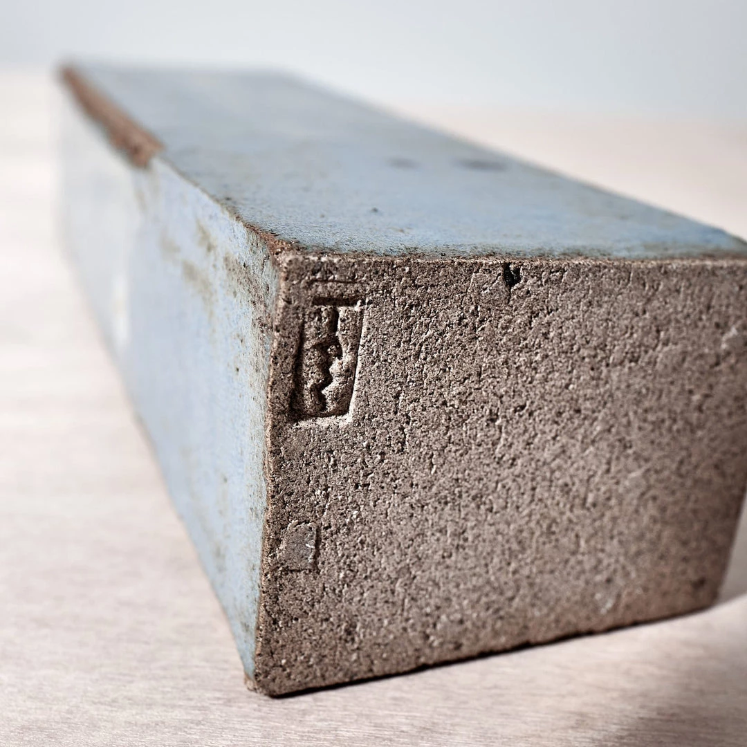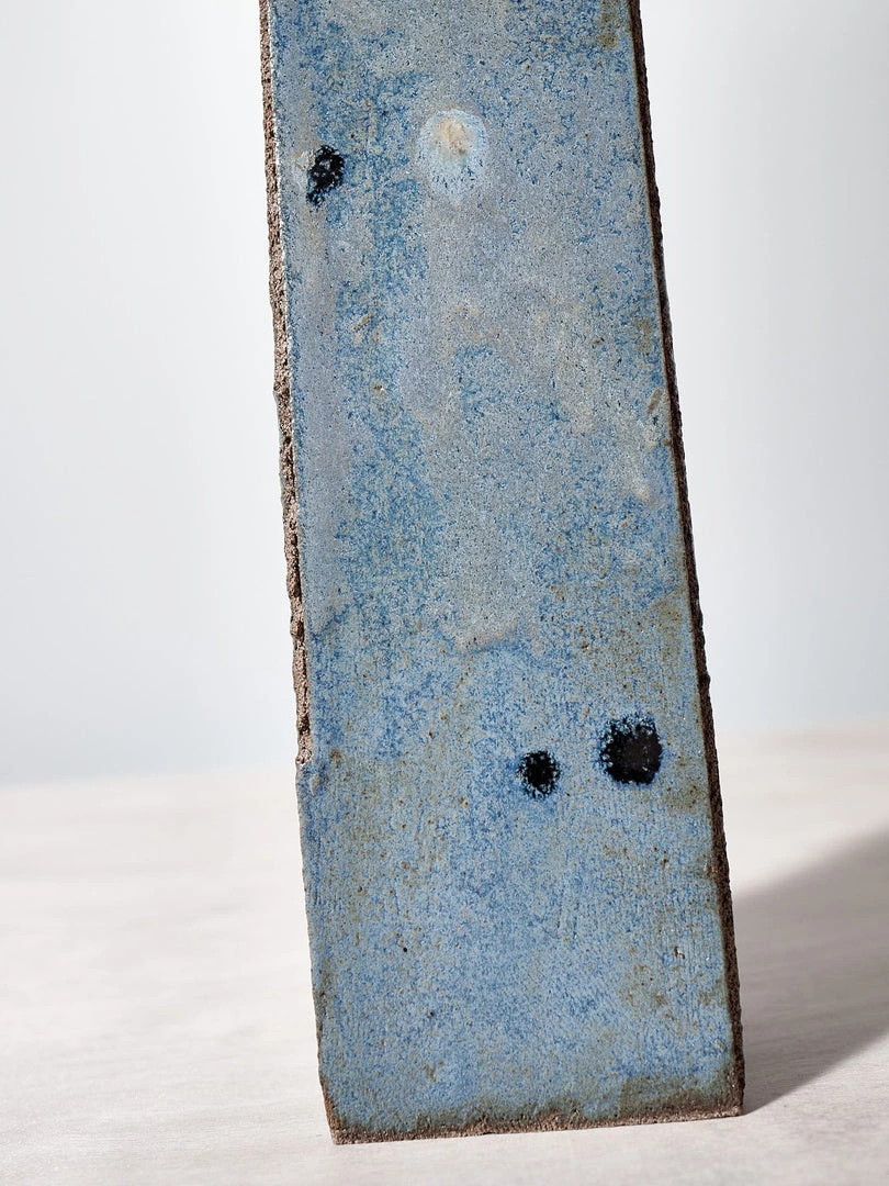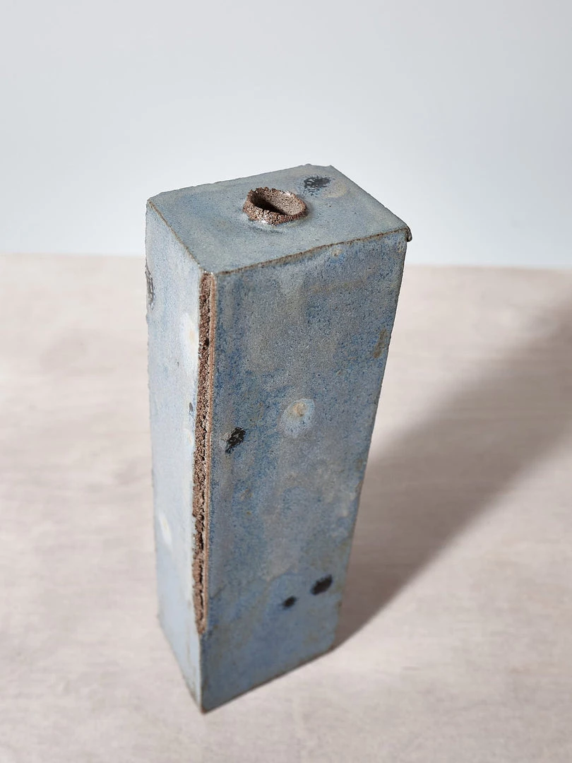 Blue base with fine warm glaze and spots of blossom over textured, slab built vase.