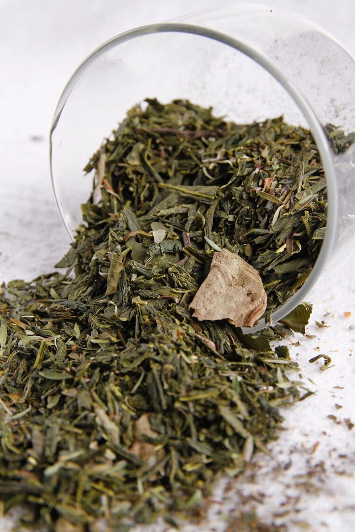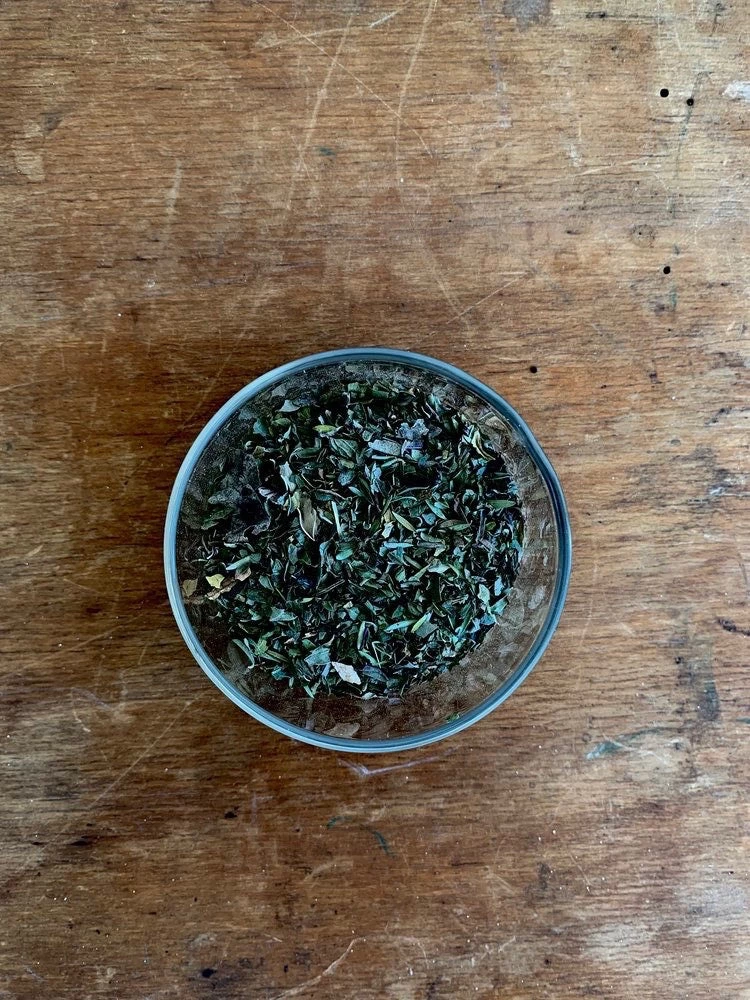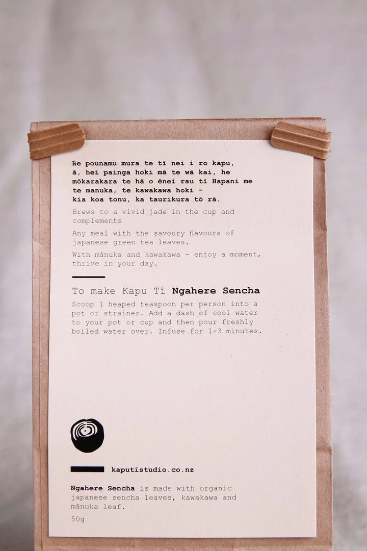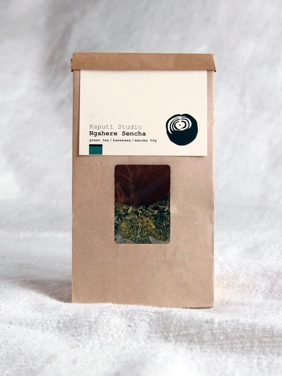 Organic Japanese sencha leaves, kawakawa, and manuka leaf.
