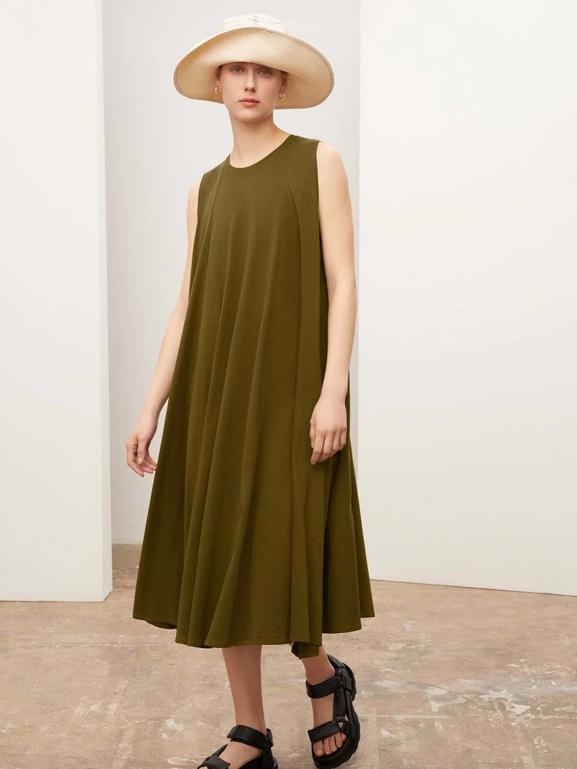 A sleeveless panelled dress with a high neckline, made from lightweight organic cotton jersey. An easy wearing style that flows loosely from the shoulders to the hemline.