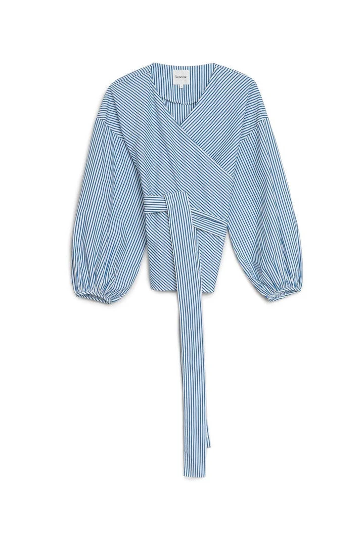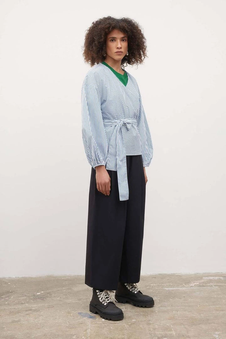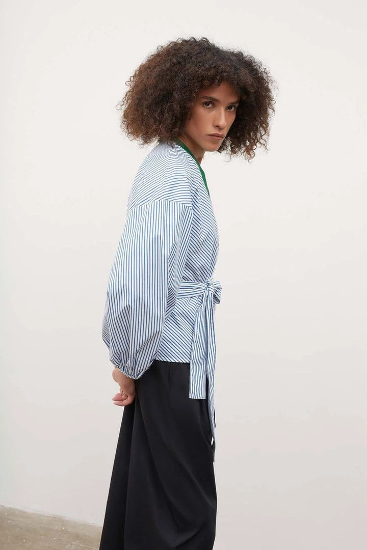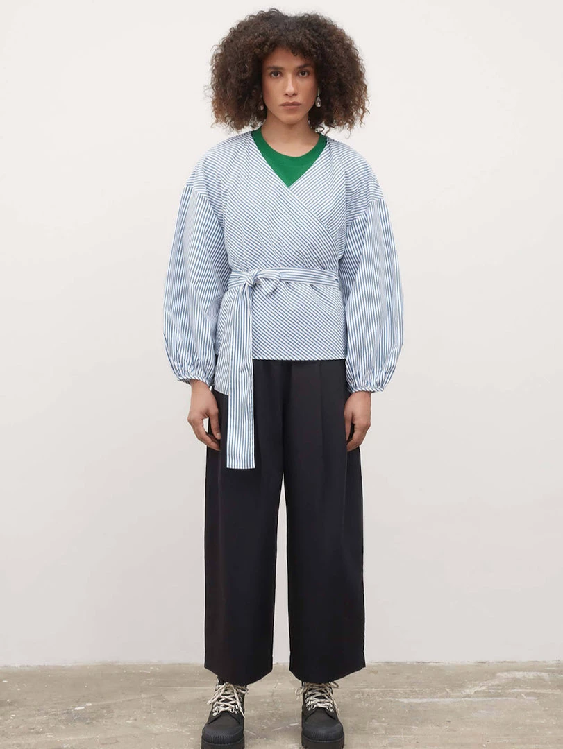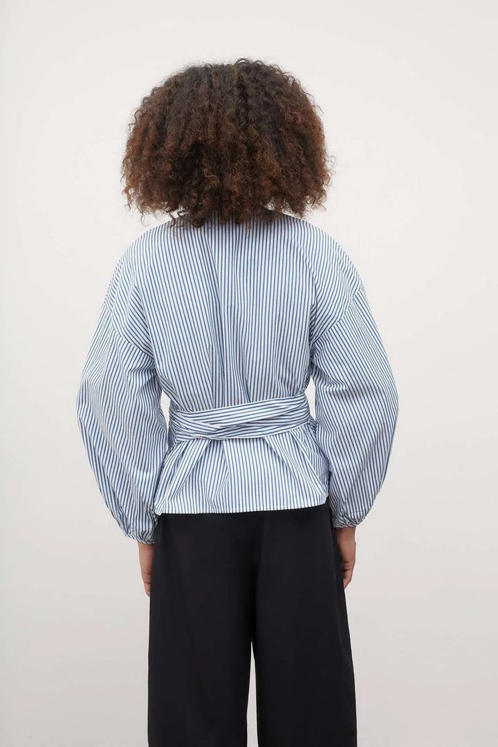 A wrap top with a full gathered sleeve, finished with a narrow binding. Made from organic cotton poplin, the top is finished with a side tie closure for an adjustable fit.