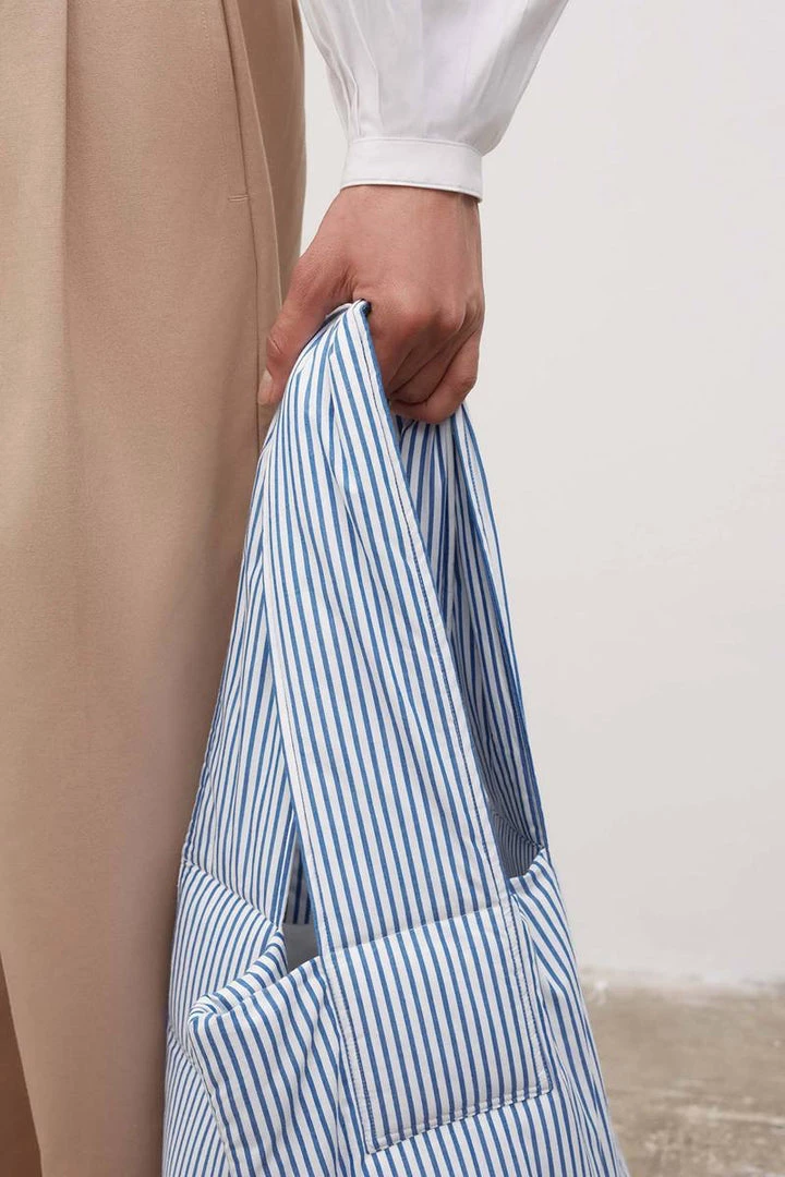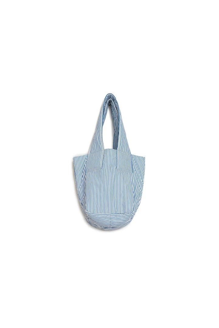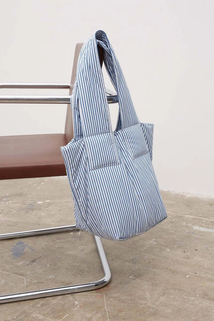 A padded organic cotton bag featuring a wide carry strap. The bag is fully lined and fastens with a cotton tie closure.