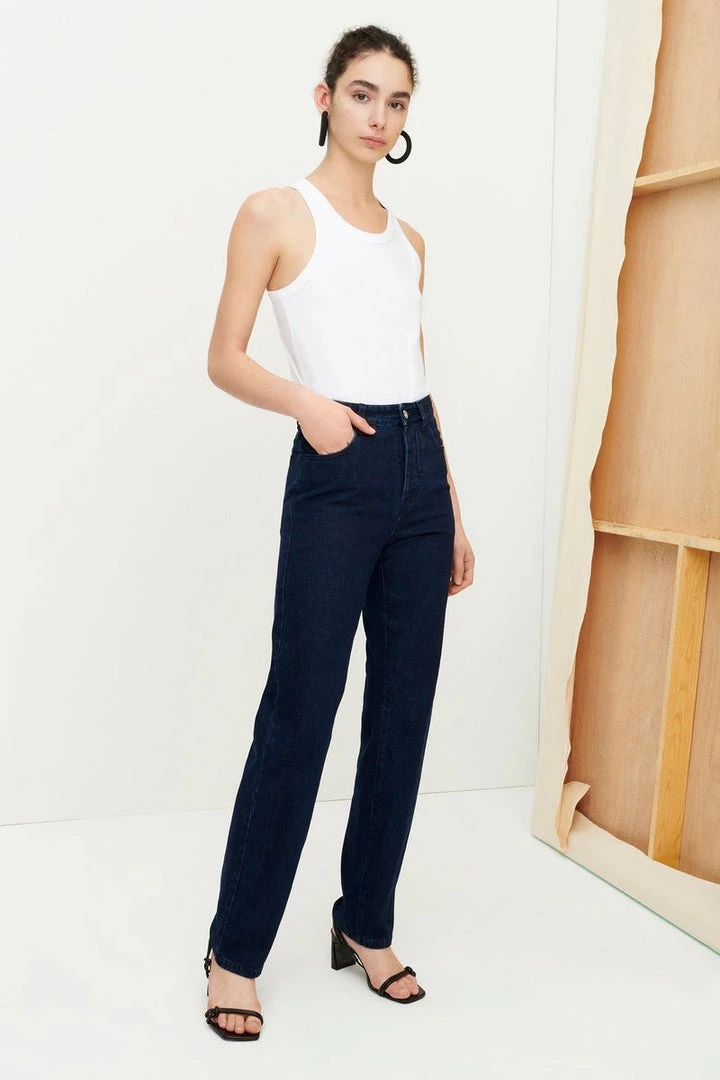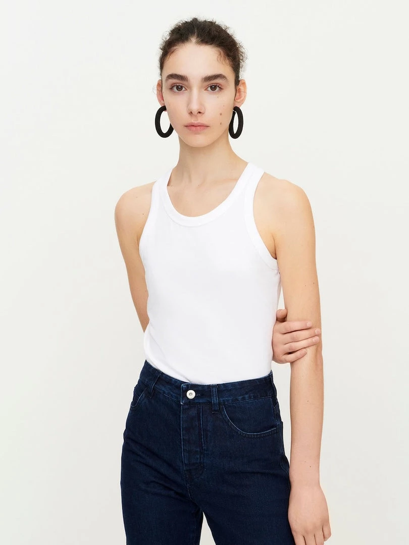 A fitted singlet with a racer back and ribbed binding around neckline and armholes, made from mid-weight organic cotton jersey.