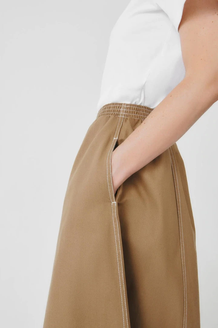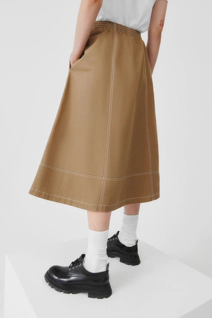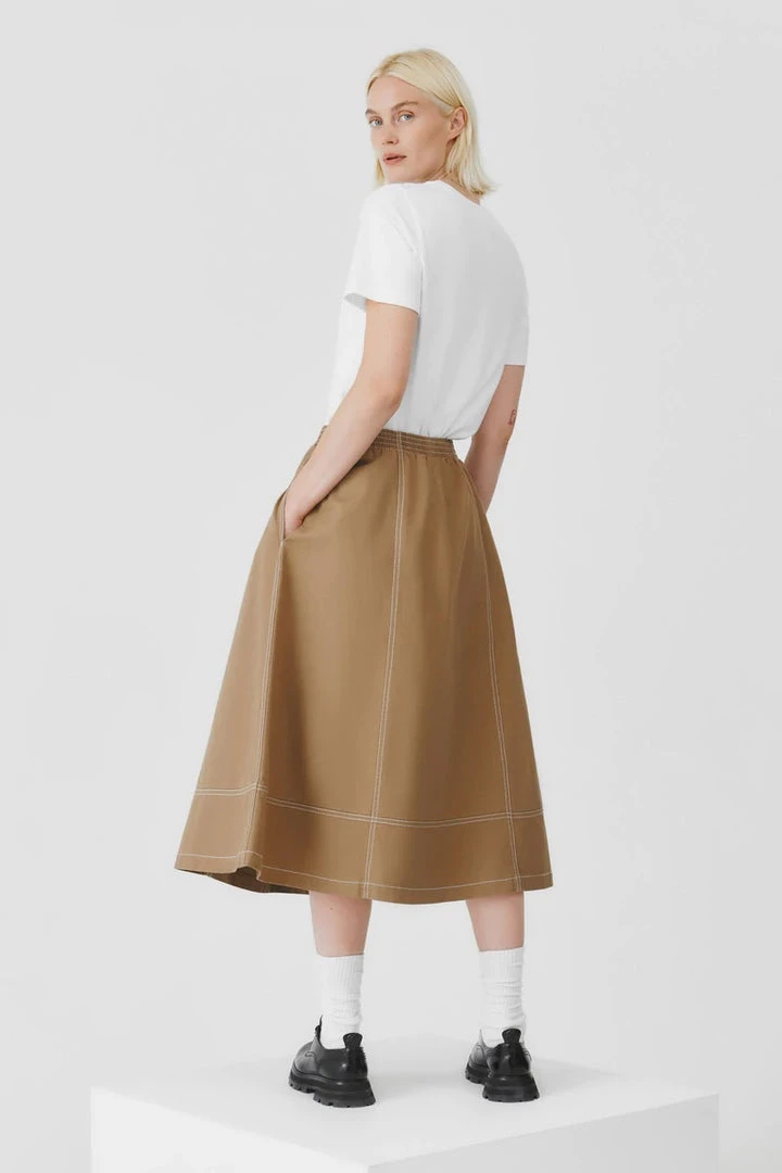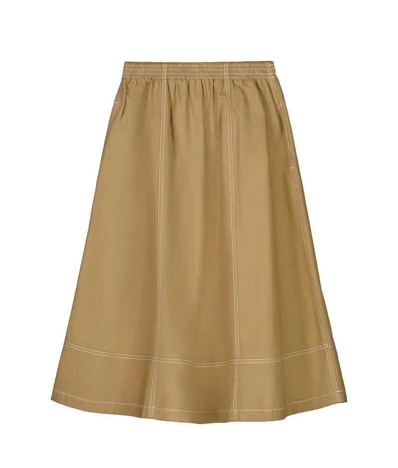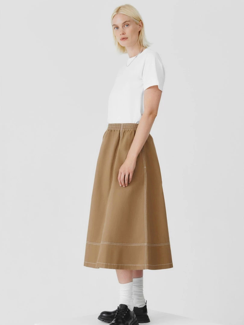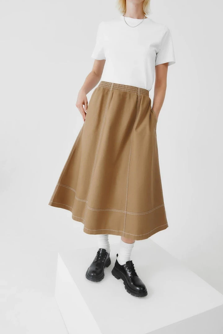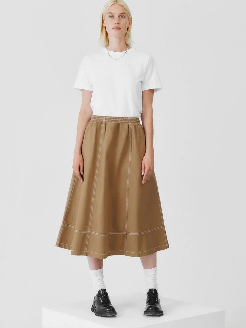 An a-line panelled skirt featuring contrast topstitch detailing, made from mid-weight organic cotton denim. The skirt features side seam pockets and is finished with a comfortable elastic waistband for a relaxed fit.