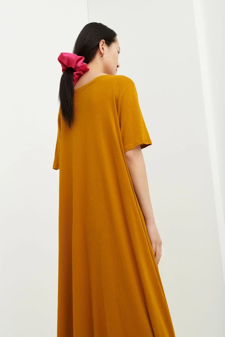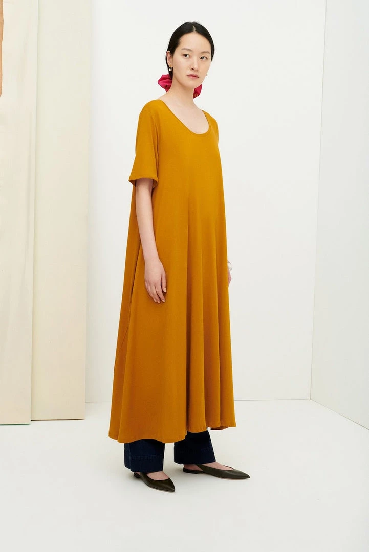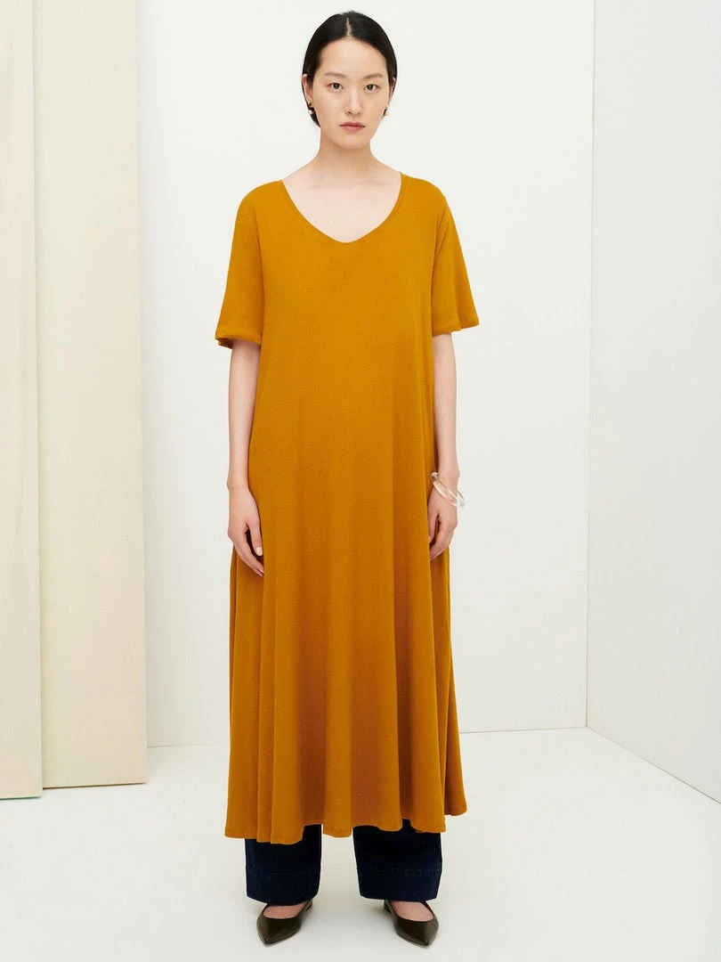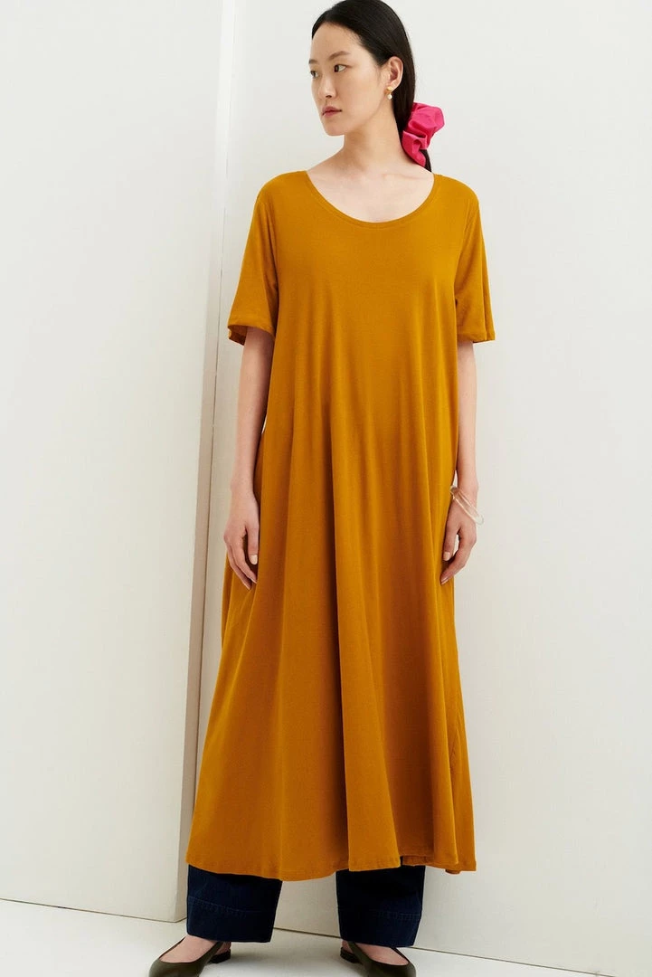 A full-length tee shirt dress with an a-line shape, made from lightweight organic cotton jersey. The dress has a scoop neckline and features our signature twisted side seams.