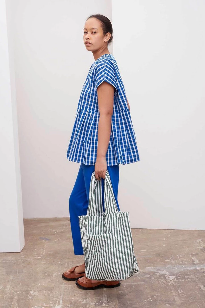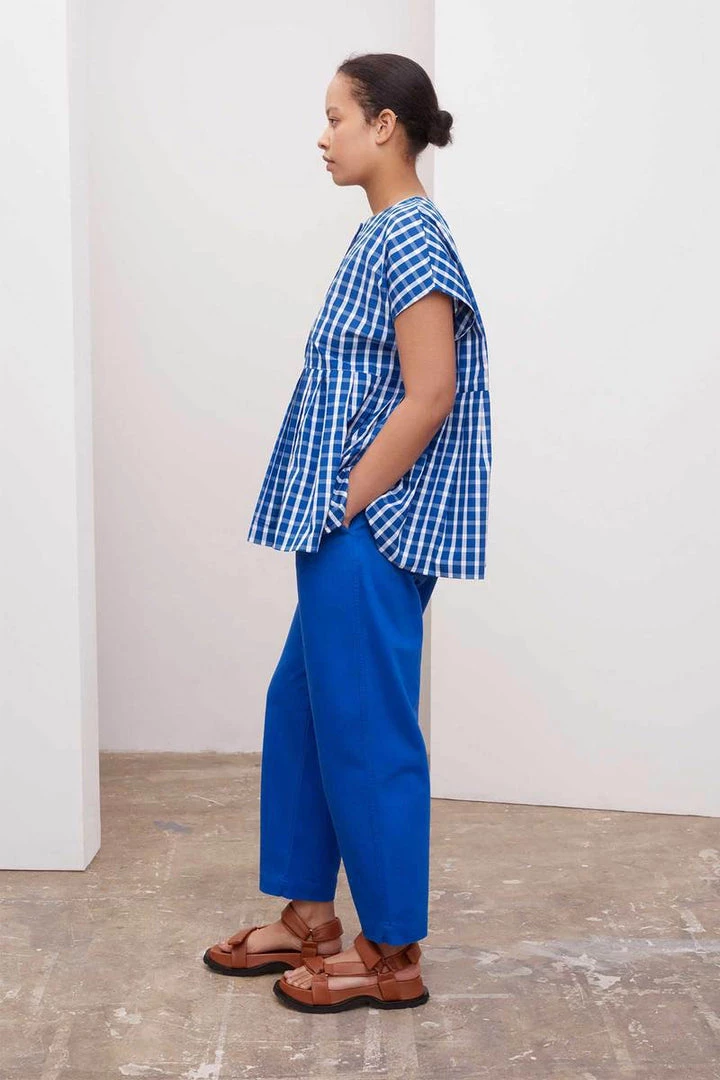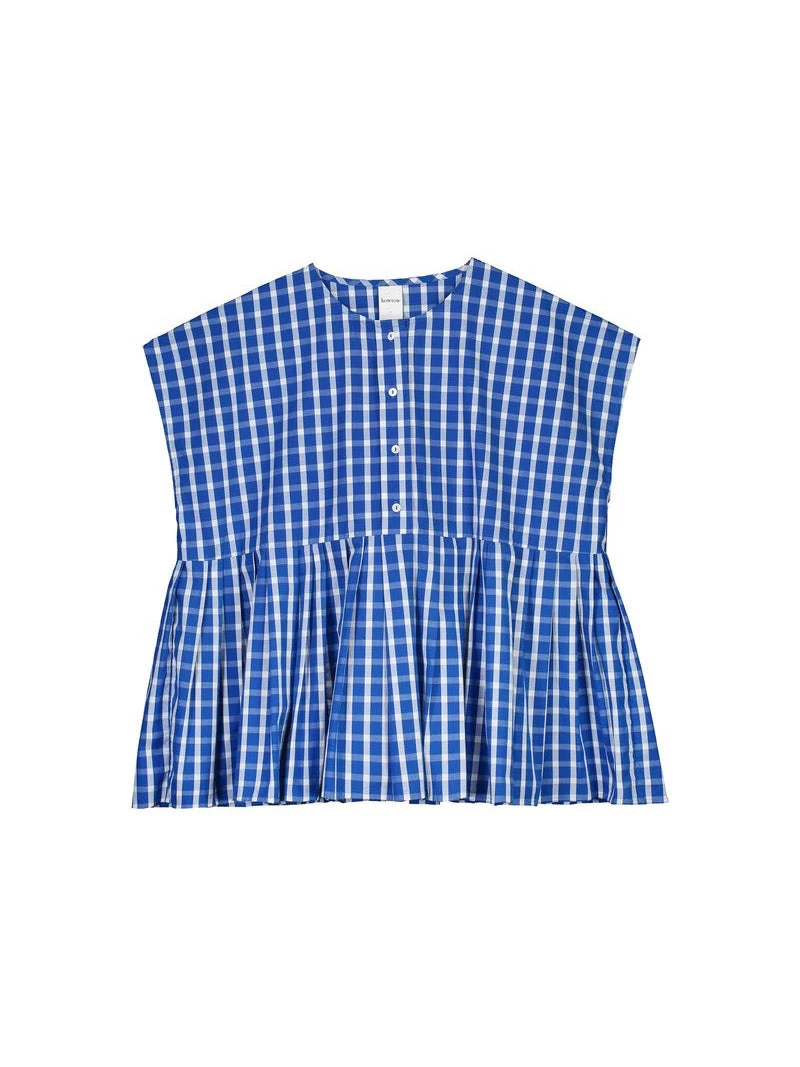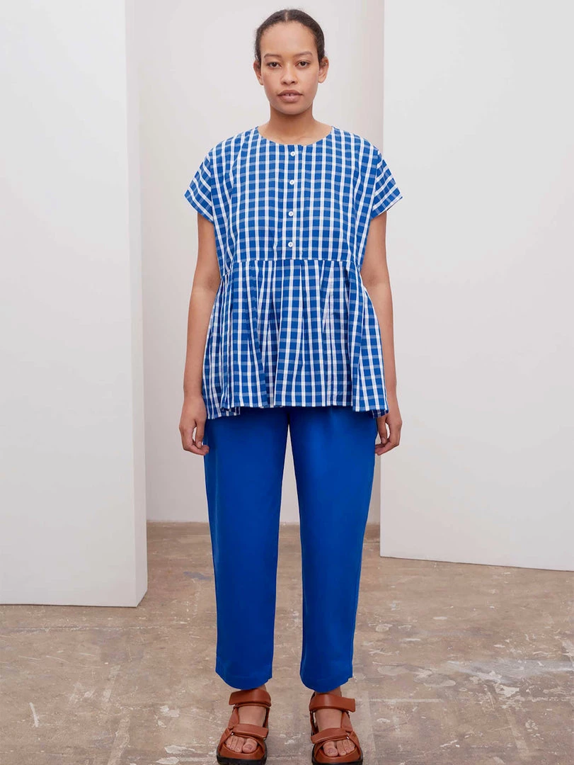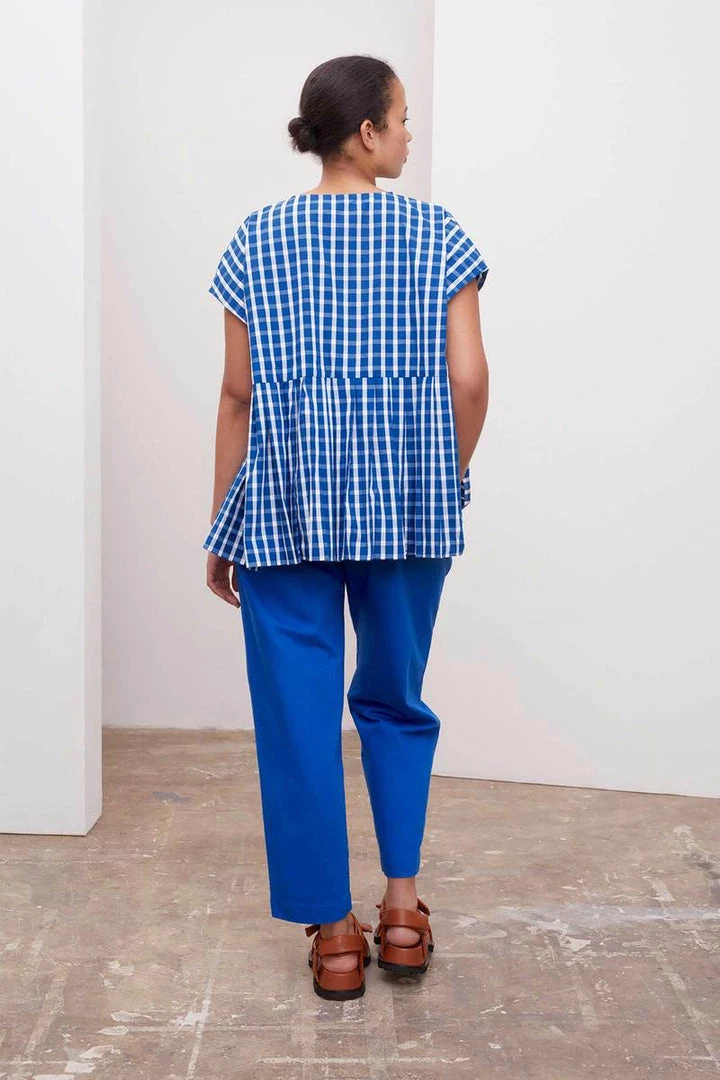 A sleeveless top with a pleated waistline, made from lightweight organic cotton poplin. The top has an oversized fit and fastens at the centre front with natural agoya shell buttons.