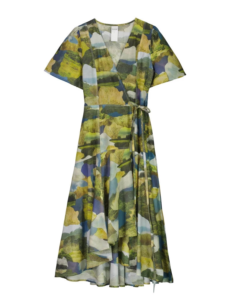 A short sleeve wrap dress with an asymmetric hemline, made from printed organic cotton voile. The dress is fitted through the bust and waist and flares out slightly below the hips. It fastens at the side waist with narrow ties.