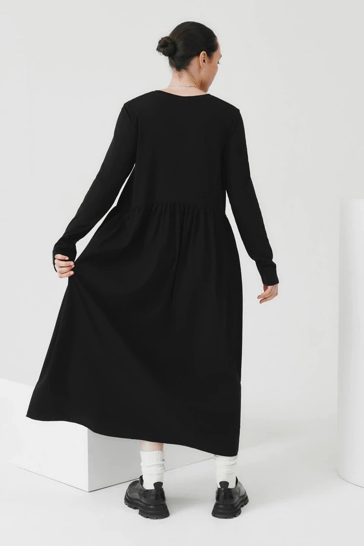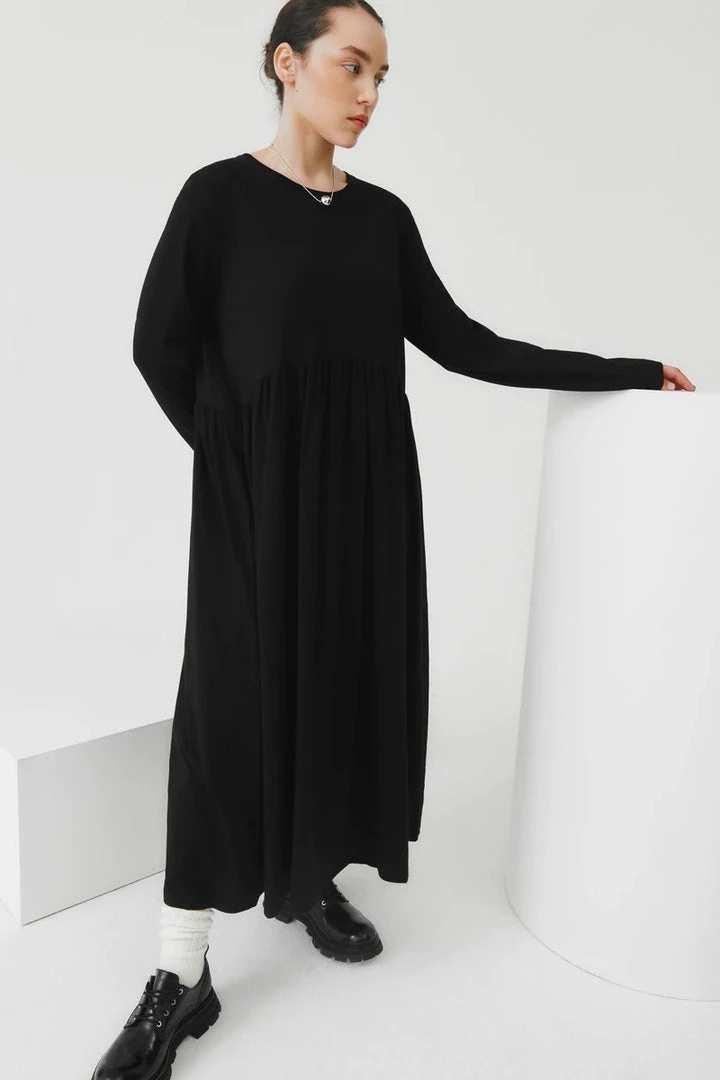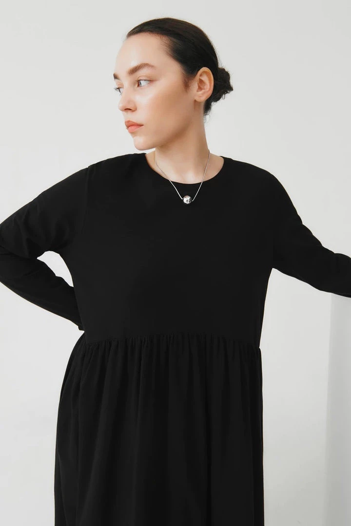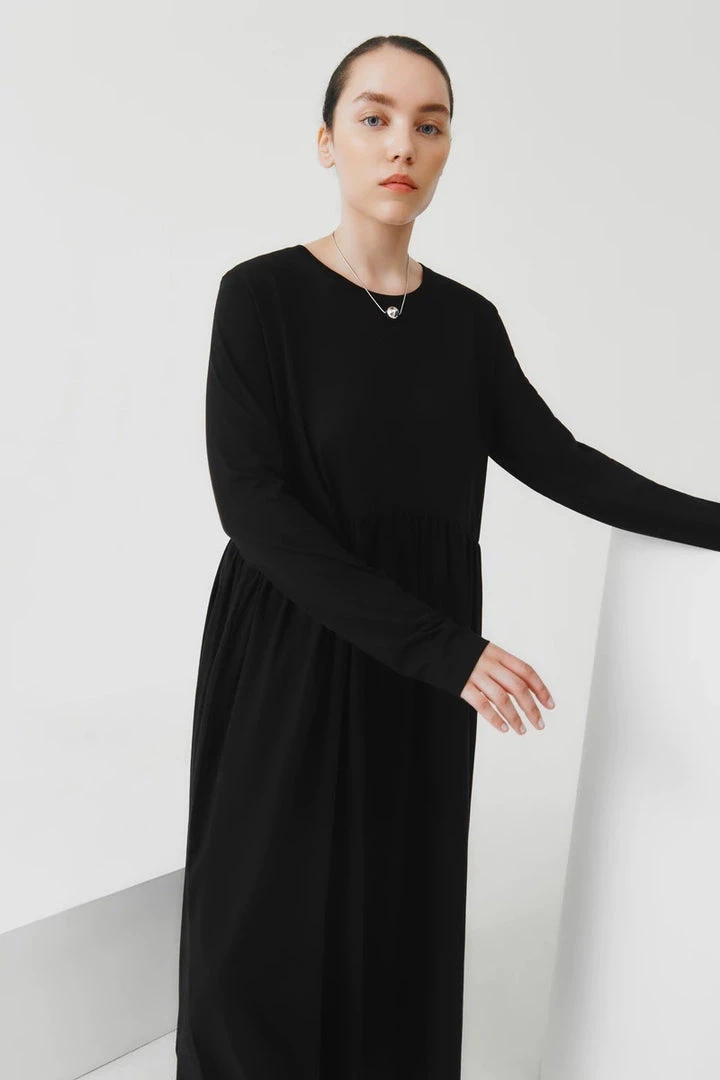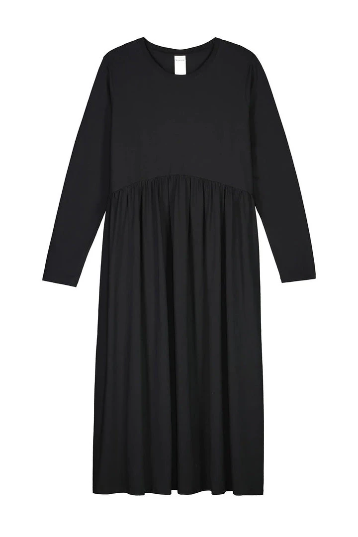A long sleeve dress with a curved, gather waist made from mid-weight organic cotton jersey. An easy wearing style with a relaxed, off the body fit.