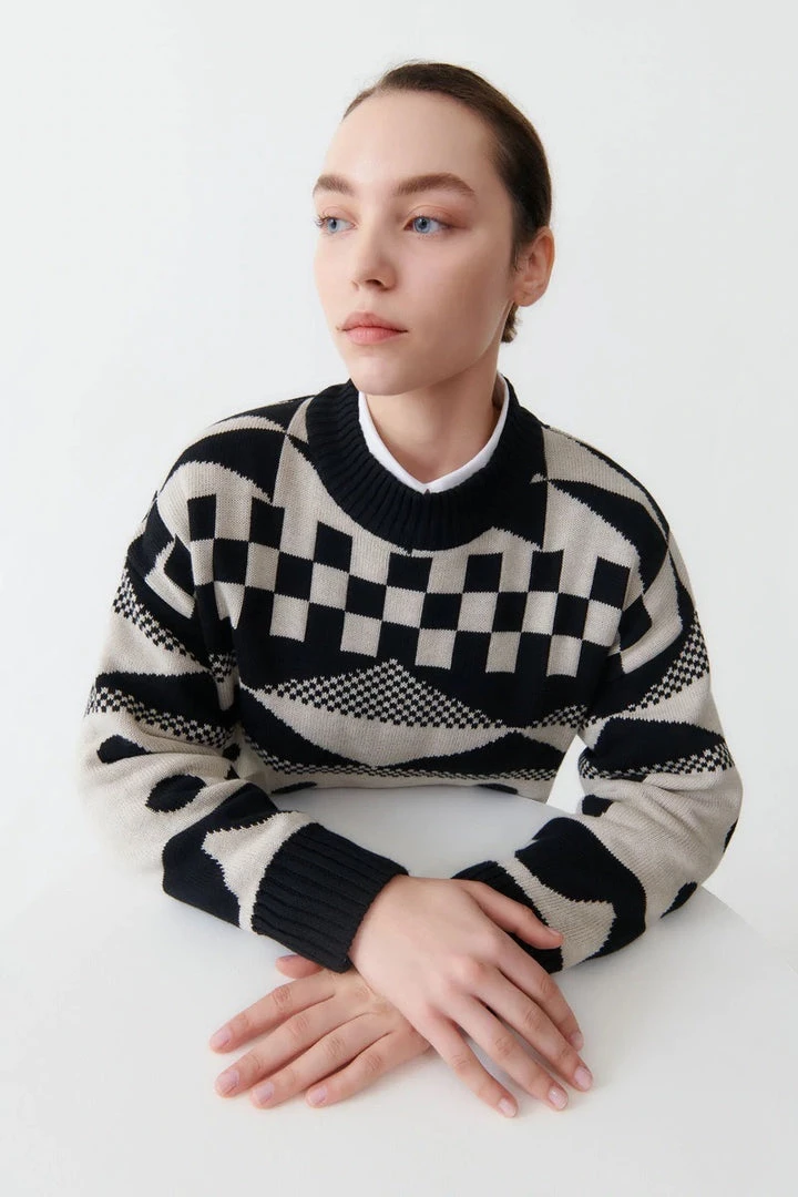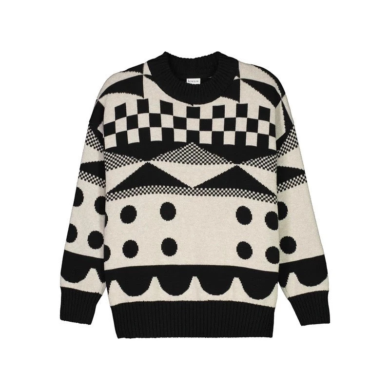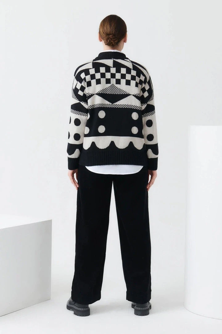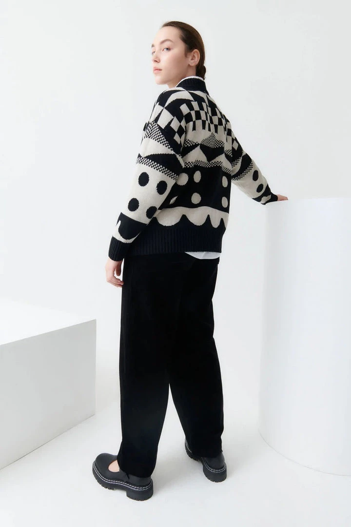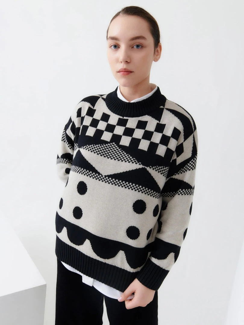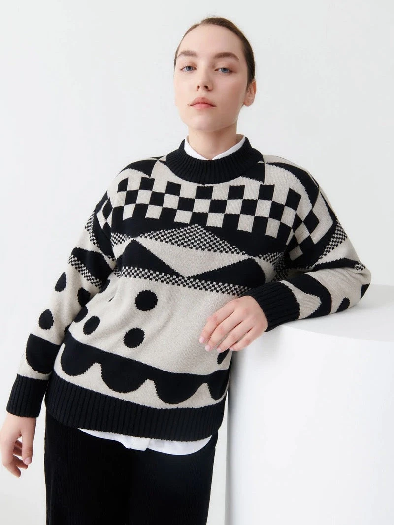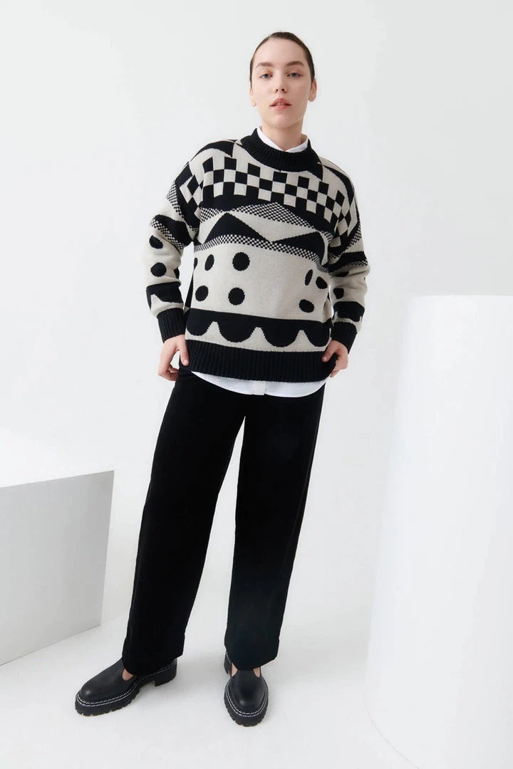 A high neck jumper featuring an all-over pattern. Made from organic cotton and knitted in a single jersey stitch, the Tapestry Jumper has an oversized fit and is finished with a contrast rib at the neckline, hem, and cuffs.