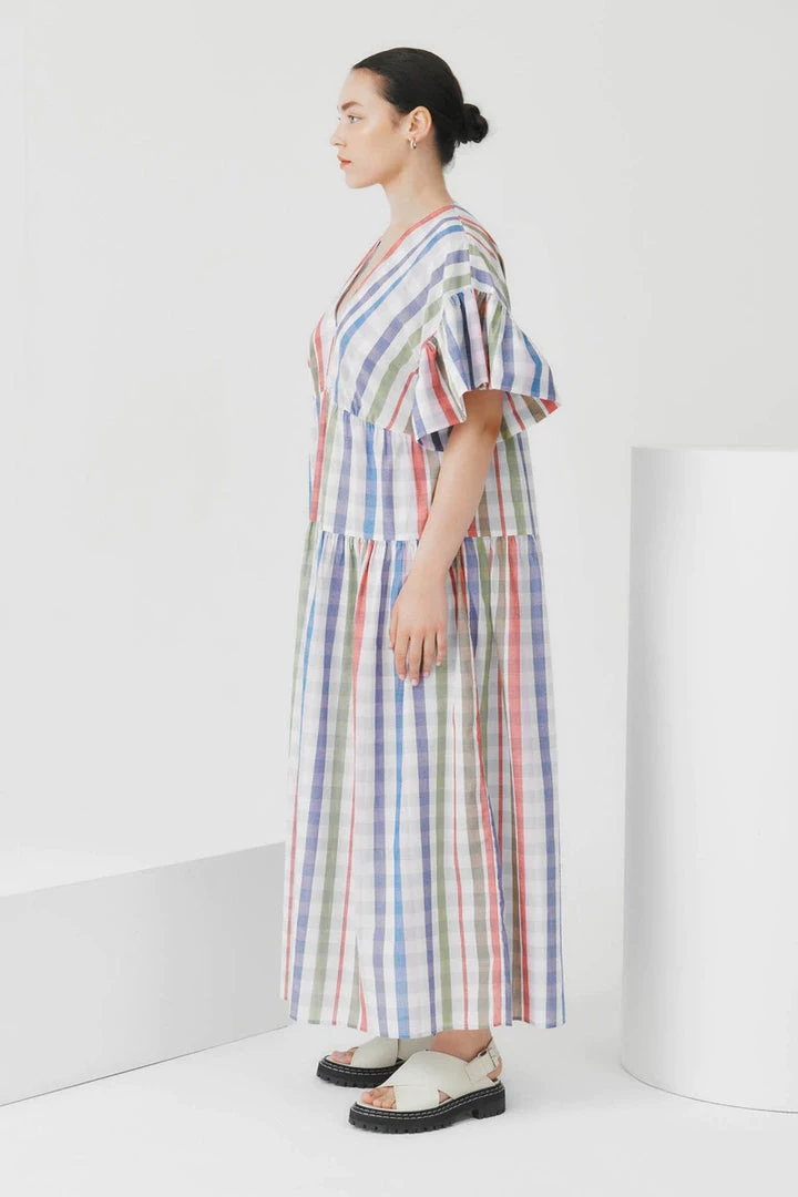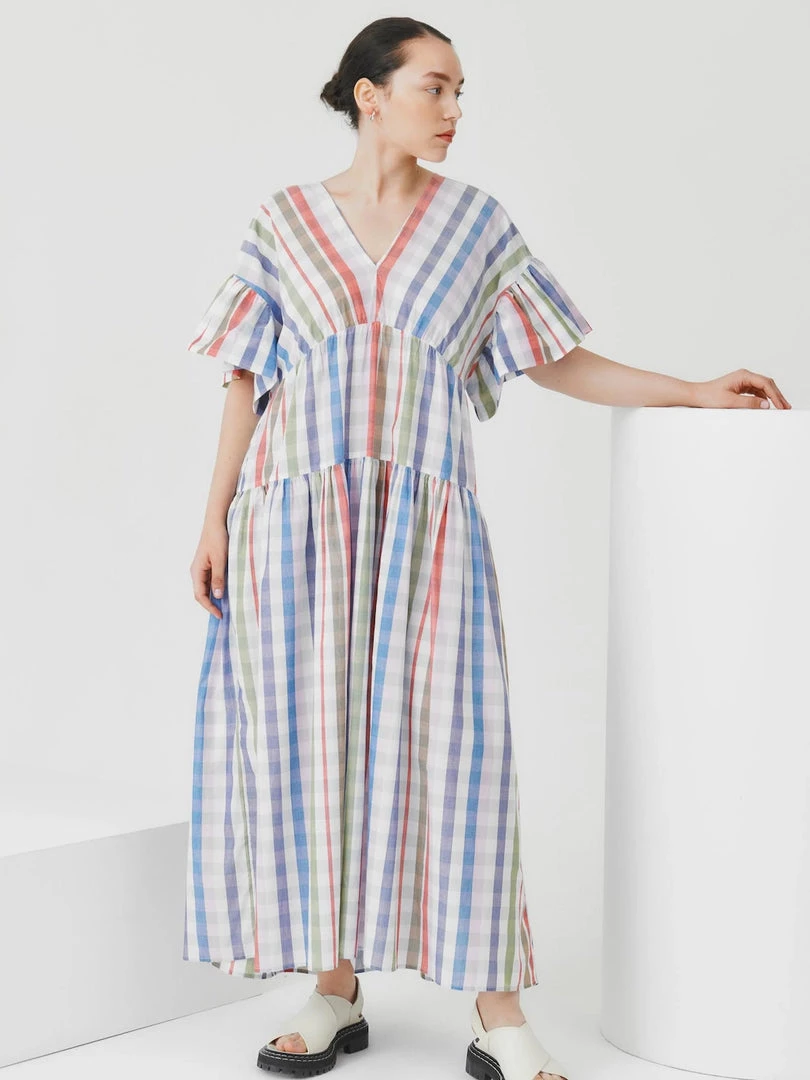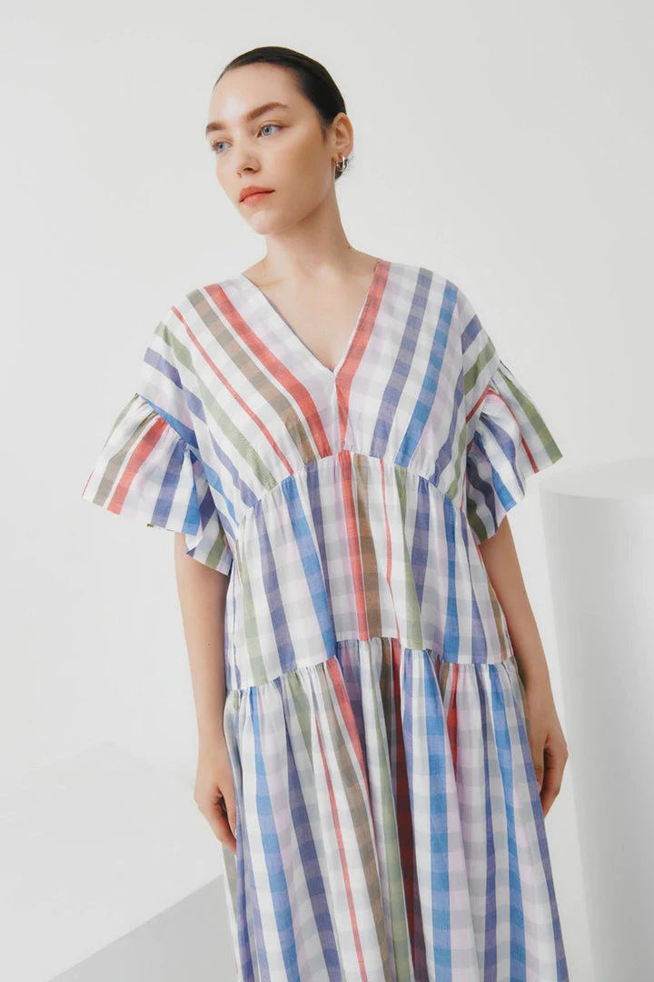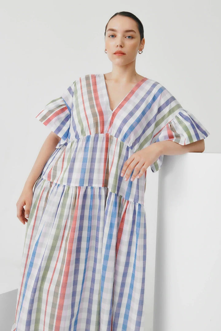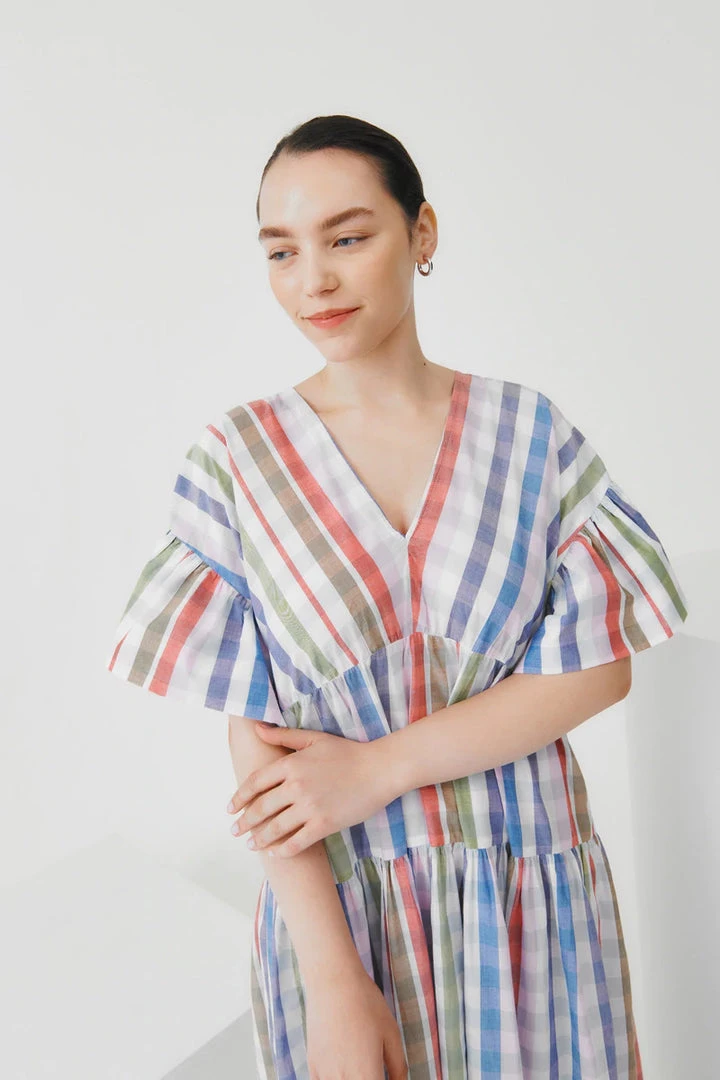 A tiered, v-neck dress with a relaxed off the body fit, featuring gathers at the waist seams and sleeves. Made from a lightweight organic cotton voile.