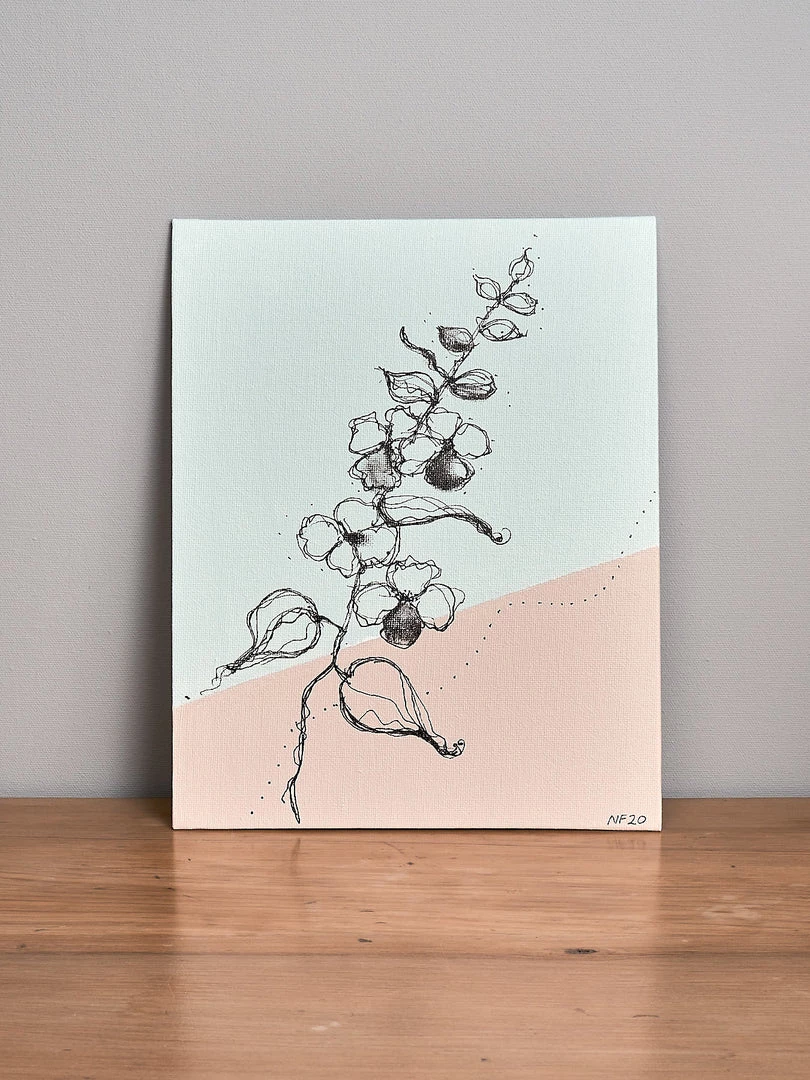 Acrylic paint and ink pen on canvas board.