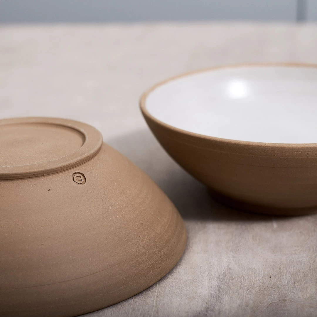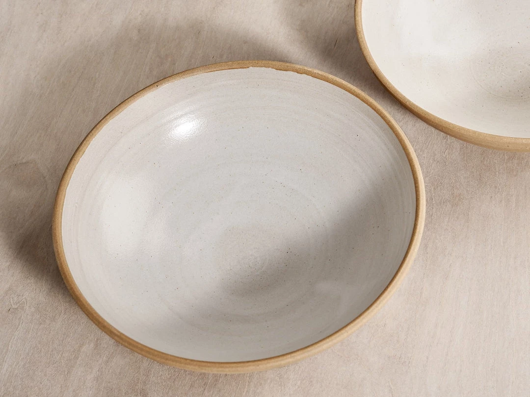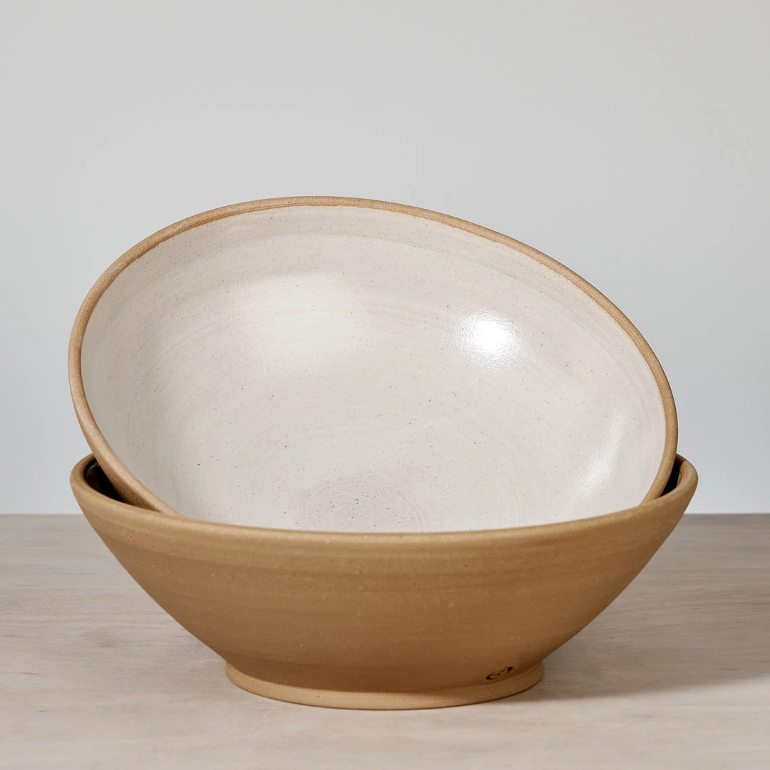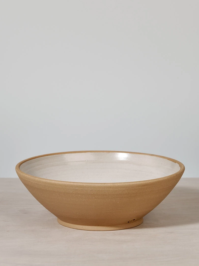 A serving bowl in toast coloured stoneware clay with a warm white satin glaze.