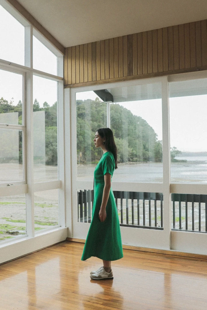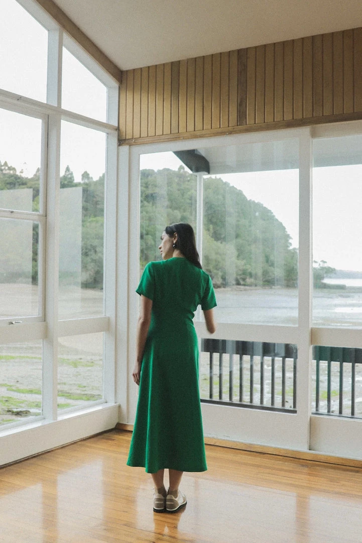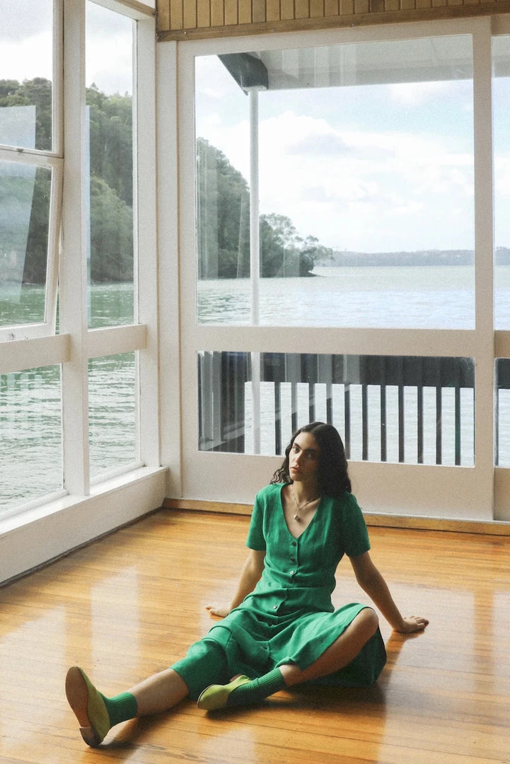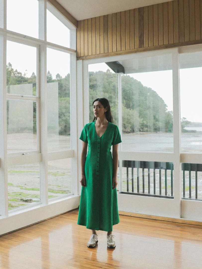 The OVNA OVICH ‘Frolic Dress’ is a relaxed and elegant dress with panels that shape to the body. Featuring a short sleeve, flared skirt and a button closure of sustainably farmed mother of pearl shell buttons. Crafted from 77% Tencel 23% Linen and made locally within a 15 km radius of their Auckland studio.