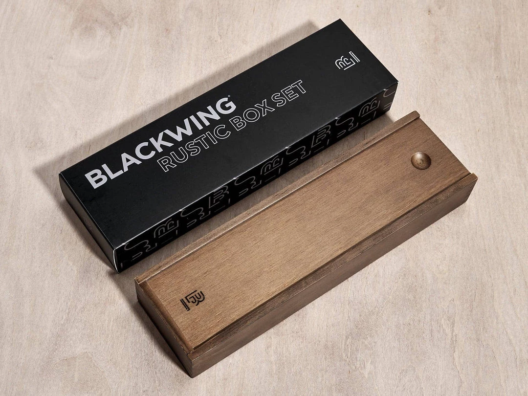 The Blackwing Rustic Box Set features 3 of each Blackwing, Pearl, 602 & Natural pencils plus the reliable Two-Step Long Point Sharpener inside of a rustic gift box. The aged wood box slides open to reveal the Blackwing pencils and a black cork-lined interior.