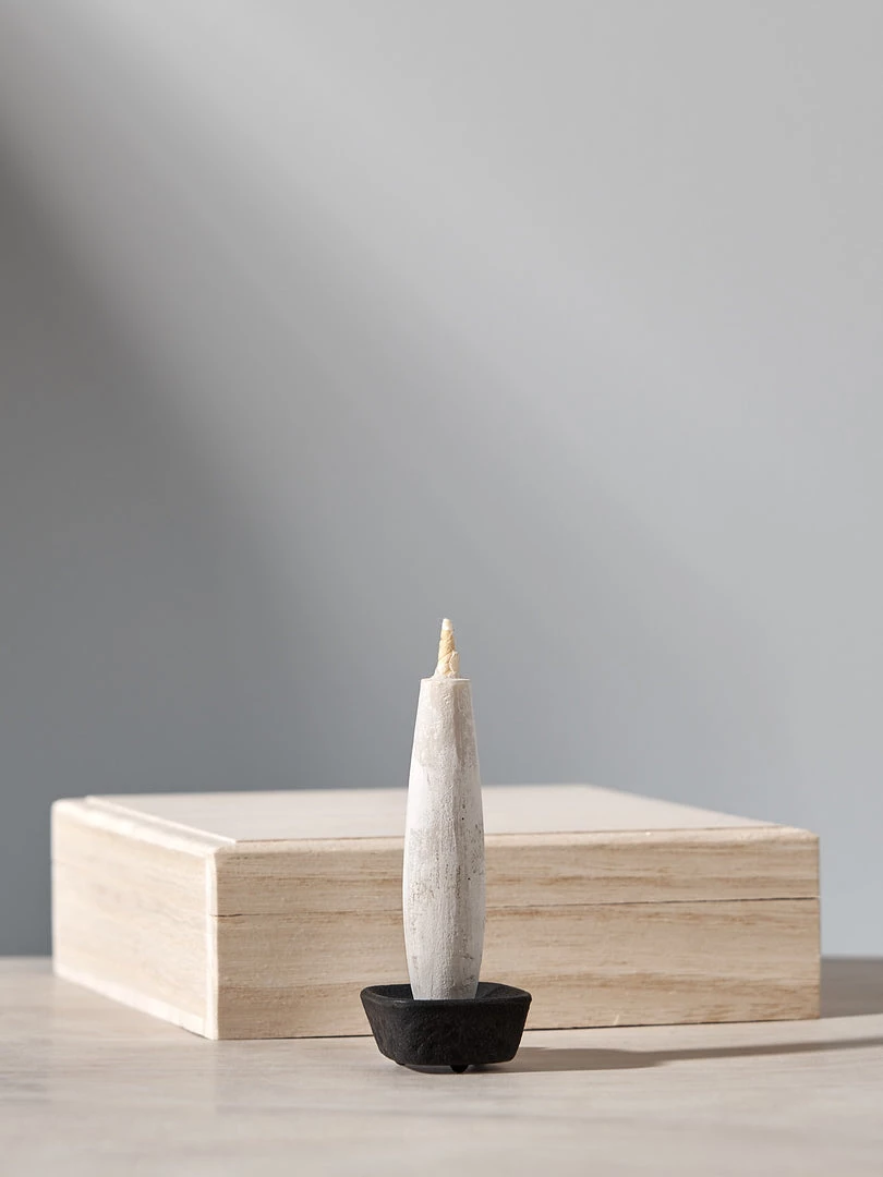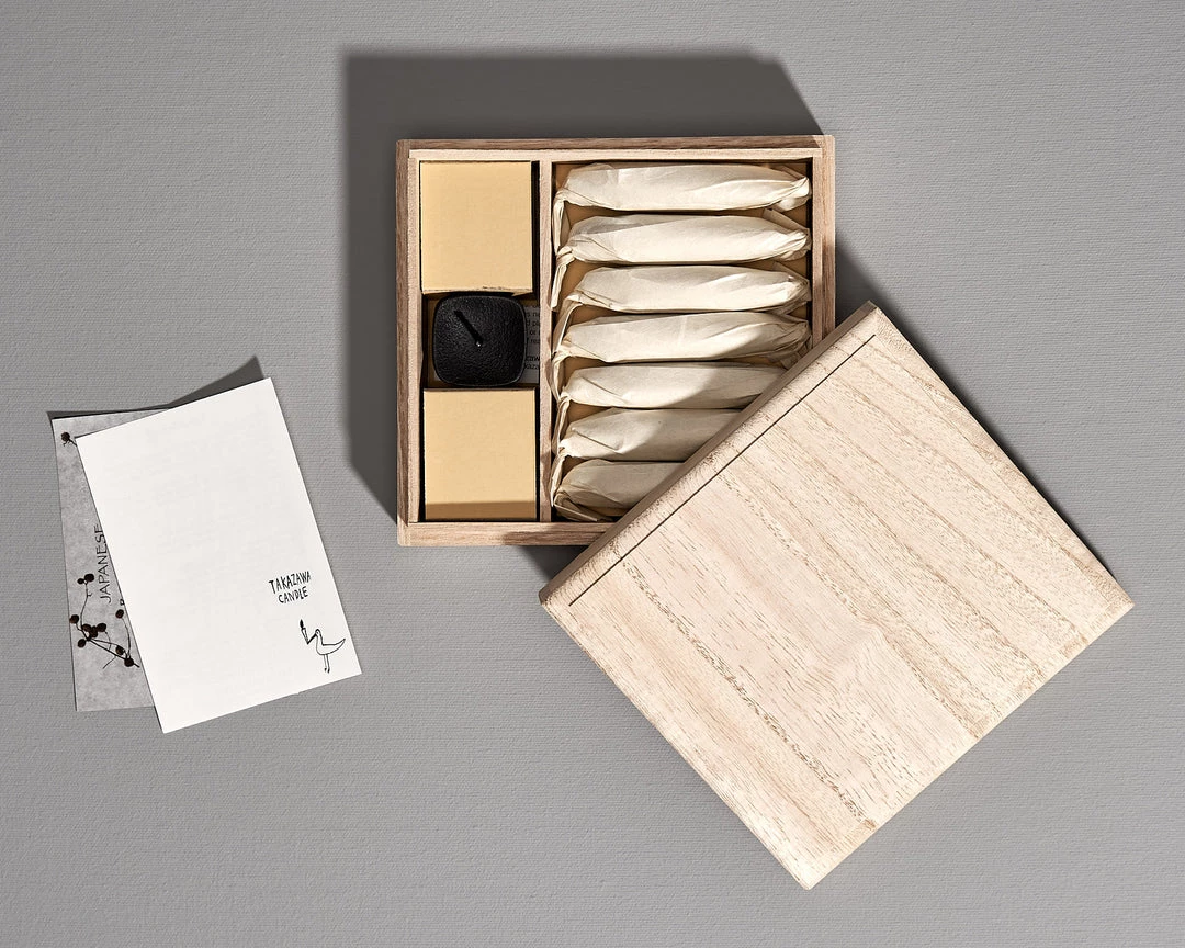 Elegant gift set containing six small Tohaku candles & a matching small Koma cast iron candle holder, all presented in an elegant wooden box with paper slip.