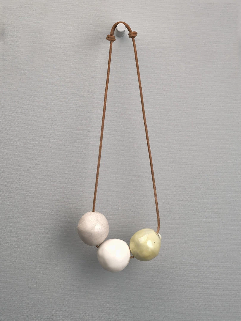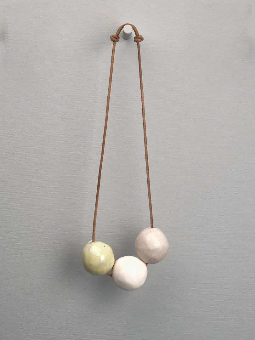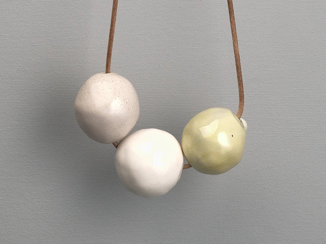 Hand coloured and glazed ceramic beads on adjustable leather cord.