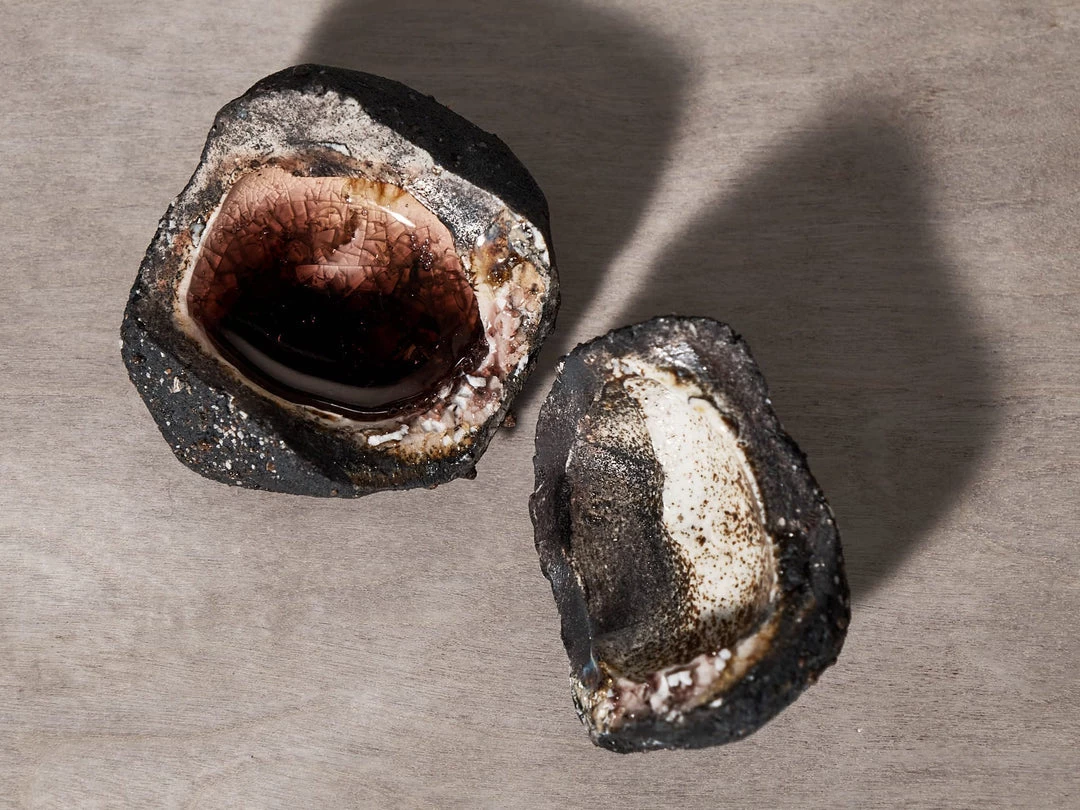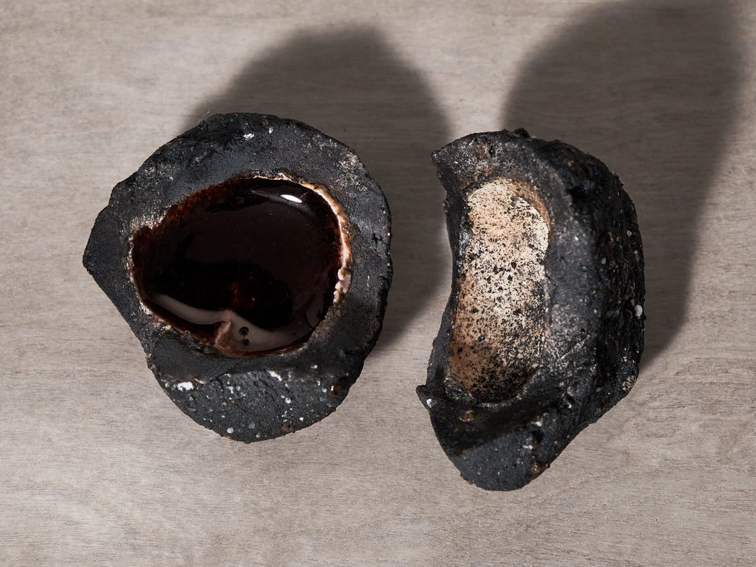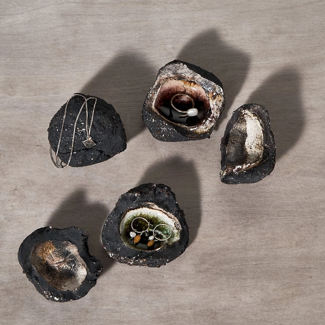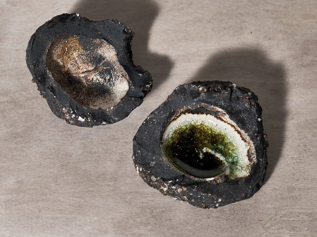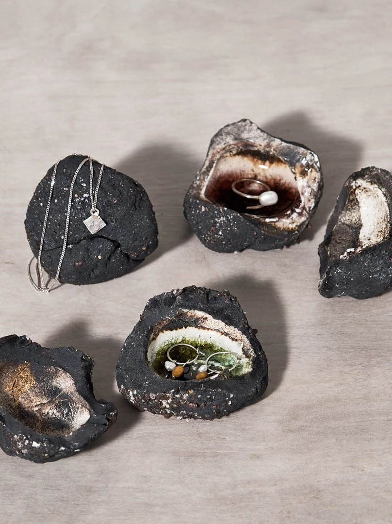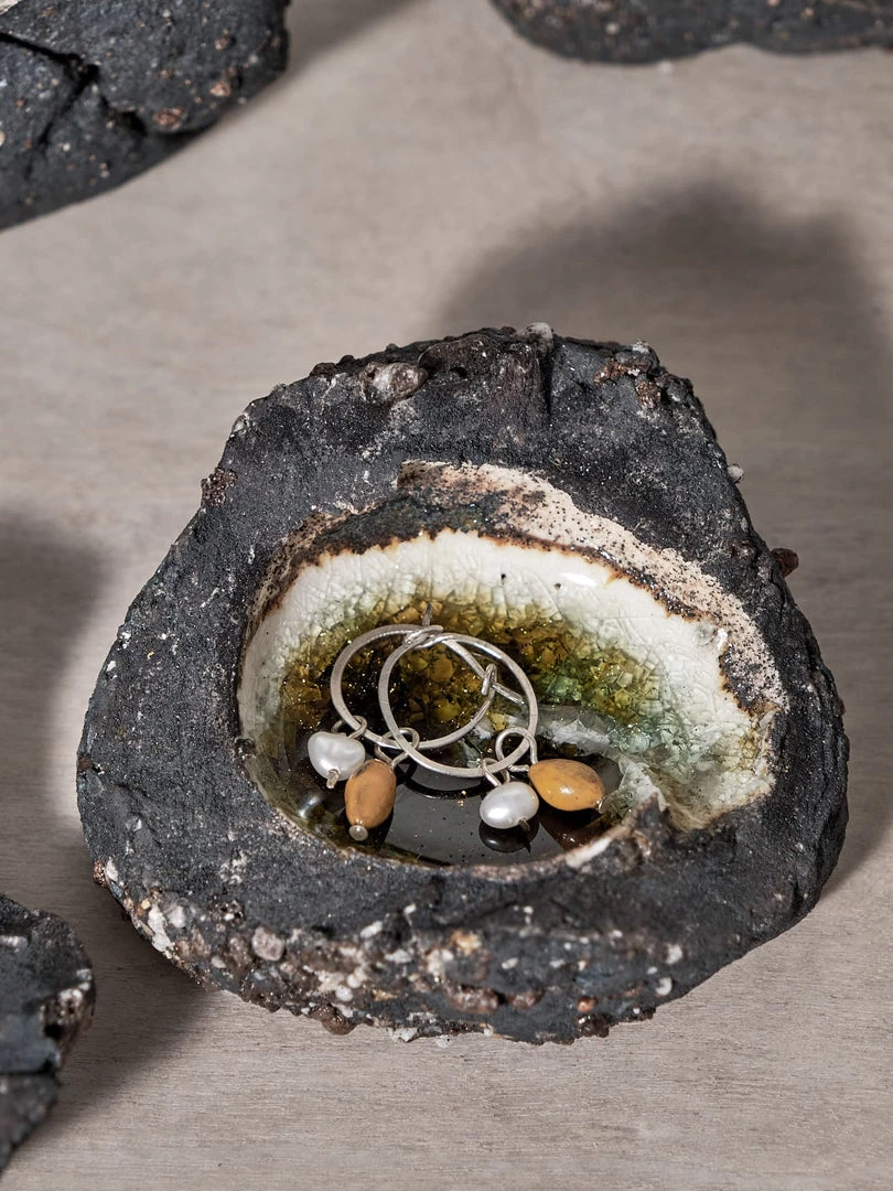 Hand made keep-sake in the form of a whimsical rock – an unassuming exterior splits to reveal a wondrous, translucent pool of coloured glass in a miniature cave of sorts.
