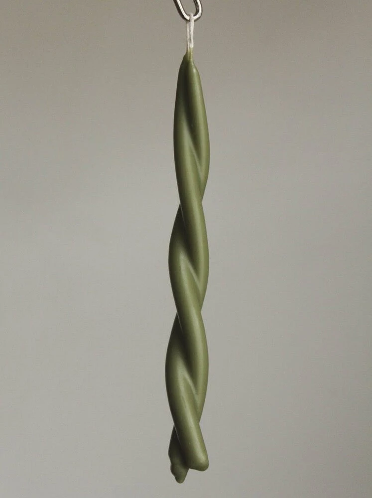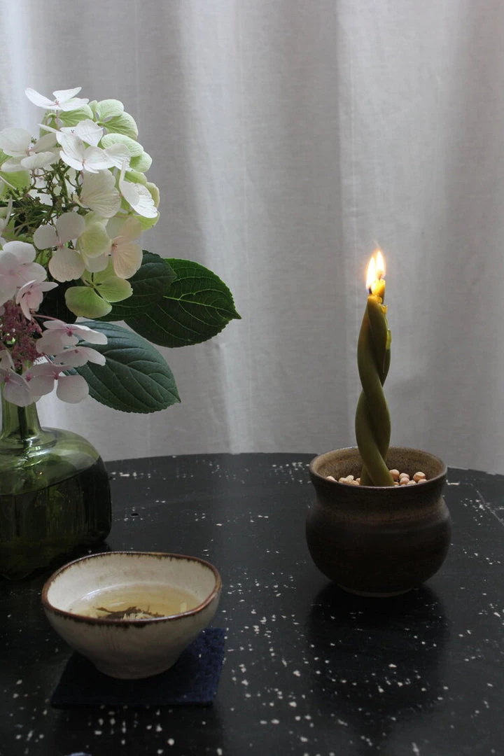 This hand-twisted beeswax candle is made from a blend of green tea wax and white beeswax.