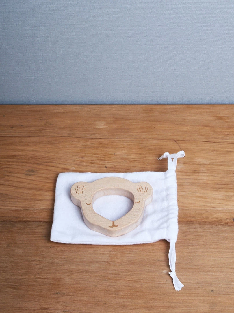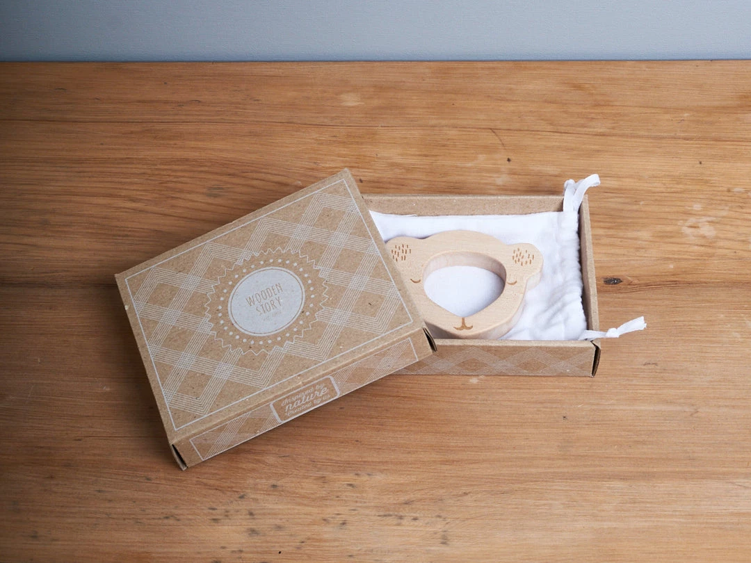The Koala Bear Teether comes in a flannel bag and is presented in a cardboard gift box, which is designed to be reused or easily recycled.